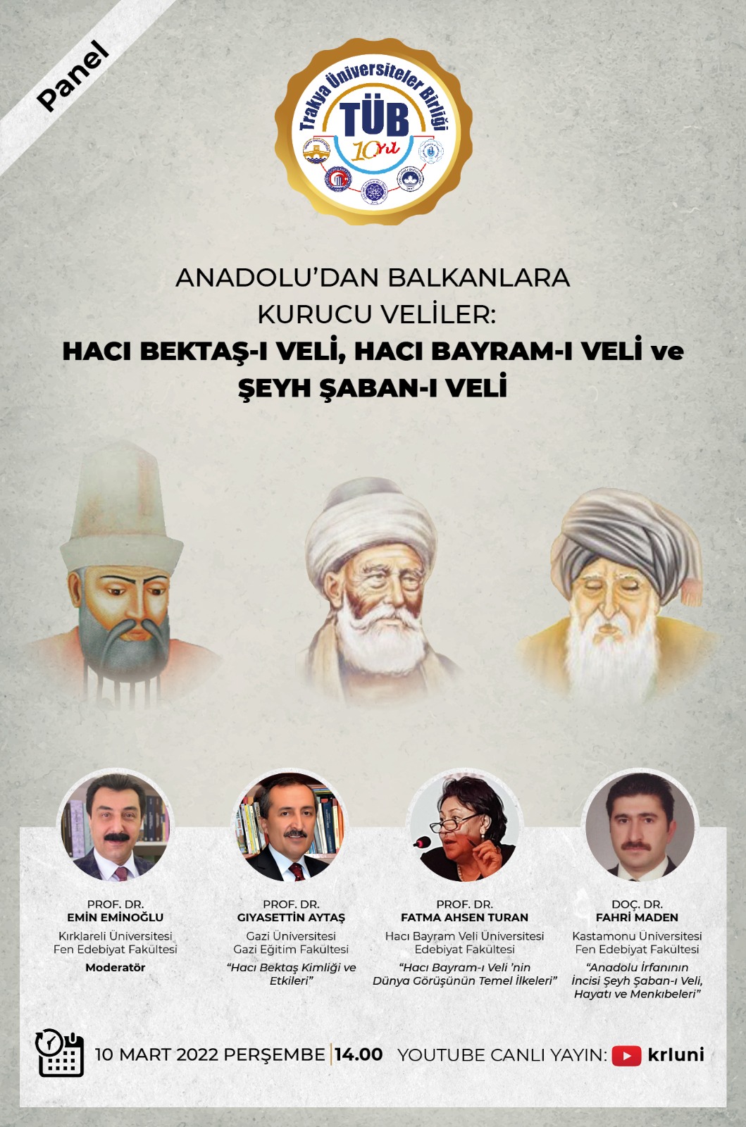 Trakya Üniversiteler Birliği 10. yıl etkinlikleri kapsamında 10 Mart 2022 tarihinde saat 14.00’te Kırklareli Üniversitesi ev sahipliğinde online olarak “Anadolu’dan Balkanlara Kurucu Velîler: Hacı Bektaş-ı Velî, Hacı Bayram-ı Velî ve Şeyh Şaban-ı Velî” başlıklı panel gerçekleştirilecektir.