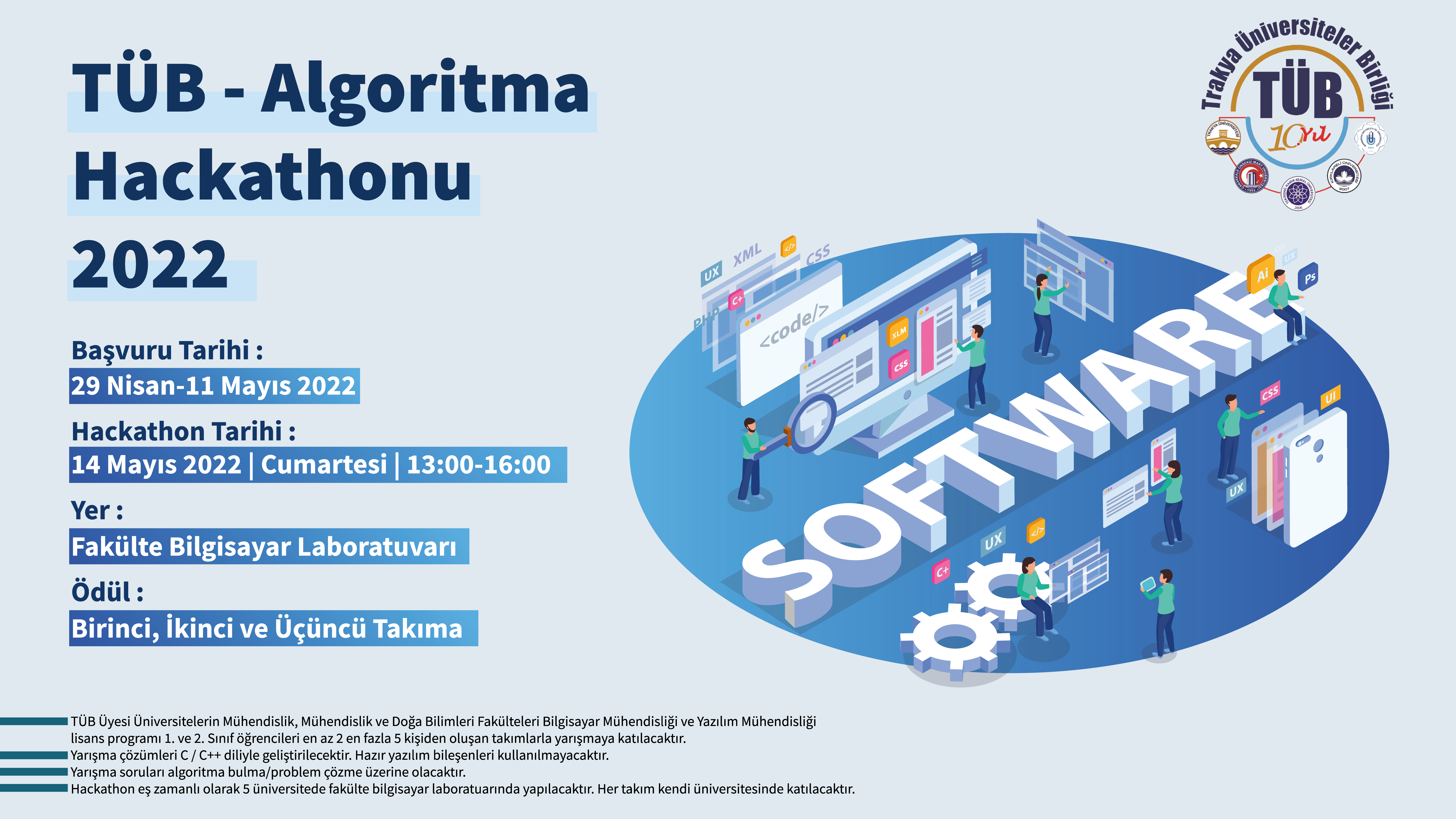 14 Mayıs 2022 tarihinde Trakya Üniversiteler Birliği üyesi üniversitelerin Mühendislik ve Doğa Bilimleri Fakültelerinin Bilgisayar Mühendisliği ve Yazılım Mühendisliği lisans programlarında okuyan 1. ve 2. Sınıf öğrencilerinin en az 2 en fazla 5 kişilik takımlar halinde katılım sağlayacağı, Birinci, İkinci ve Üçüncü gruplara sürpriz yarışma hediyelerinin verileceği TÜB-Algoritma Hackathonu düzenlenecektir.