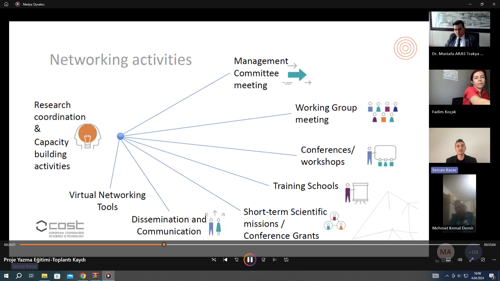 Sunumu yapan Çanakkale Onsekiz Mart Üniversitesi Moleküler Biyoloji ve Genetik Bölümü’nden Doç. Dr. Sercan KARAV, “Proje Yazma Eğitimi çerçevesinde sunumunu gerçekleştirerek deneyimlerini ve proje yazma adımlarını paylaştı. Sunumun sonrasında eğitimin soru-cevap bölümü, katılımcıların konu ile ilgili soru, görüş ve önerilerinin alınmasının ardından sona erdi.