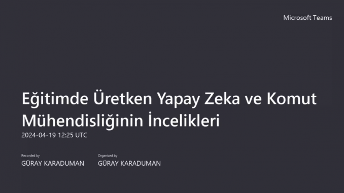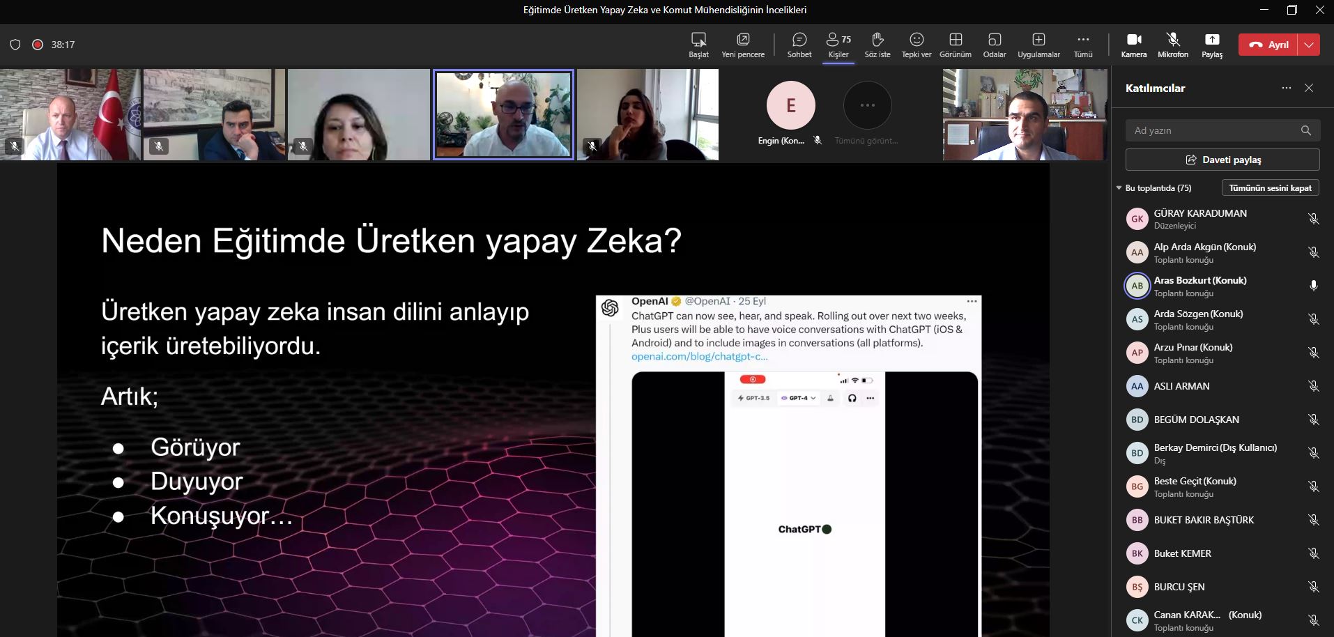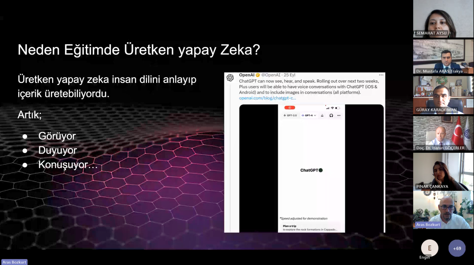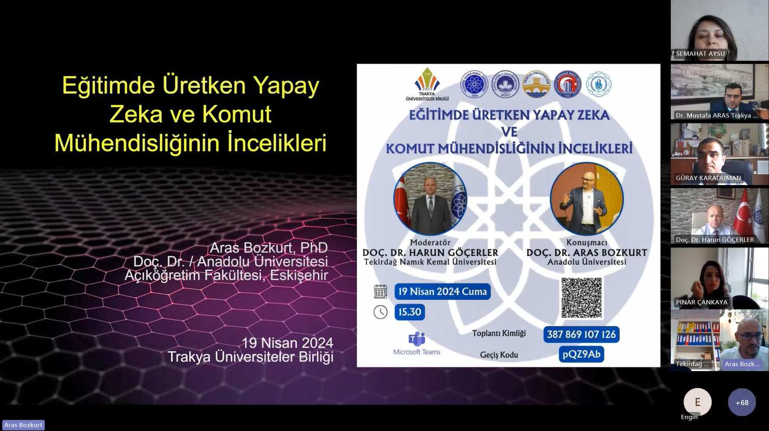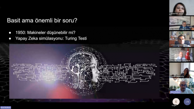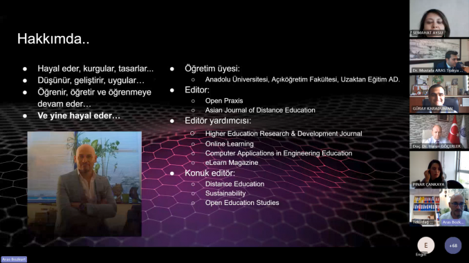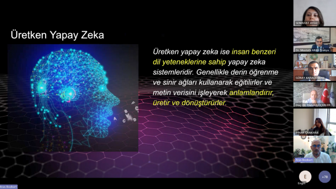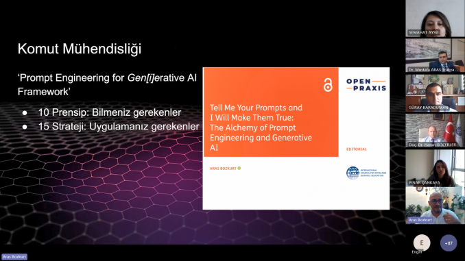 Etkinliğin moderatörlüğünü Tekirdağ Namık Kemal Üniversitesi Yabancı Diller Yüksekokulu Müdürü Doç. Dr. Harun GÖÇERLER üstlenirken, sunumu yapan Anadolu Üniversitesi‘nden Doç. Dr. Aras BOZKURT “Eğitimde Üretken Yapay Zekâ ve Komut Mühendisliğinin İncelikleri” konusunda sunumunu gerçekleştirdi. Sunumunda üretken yapay zekânın sunduğu fırsatlar ve tehditlerden bahsederek üretken yapay zekânın insanların yerini almayacağını, ancak üretken yapay zekâyı iyi kullananların kullanamayanların yerini alacağını belirtti.