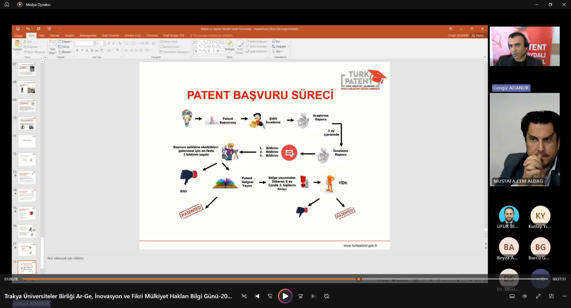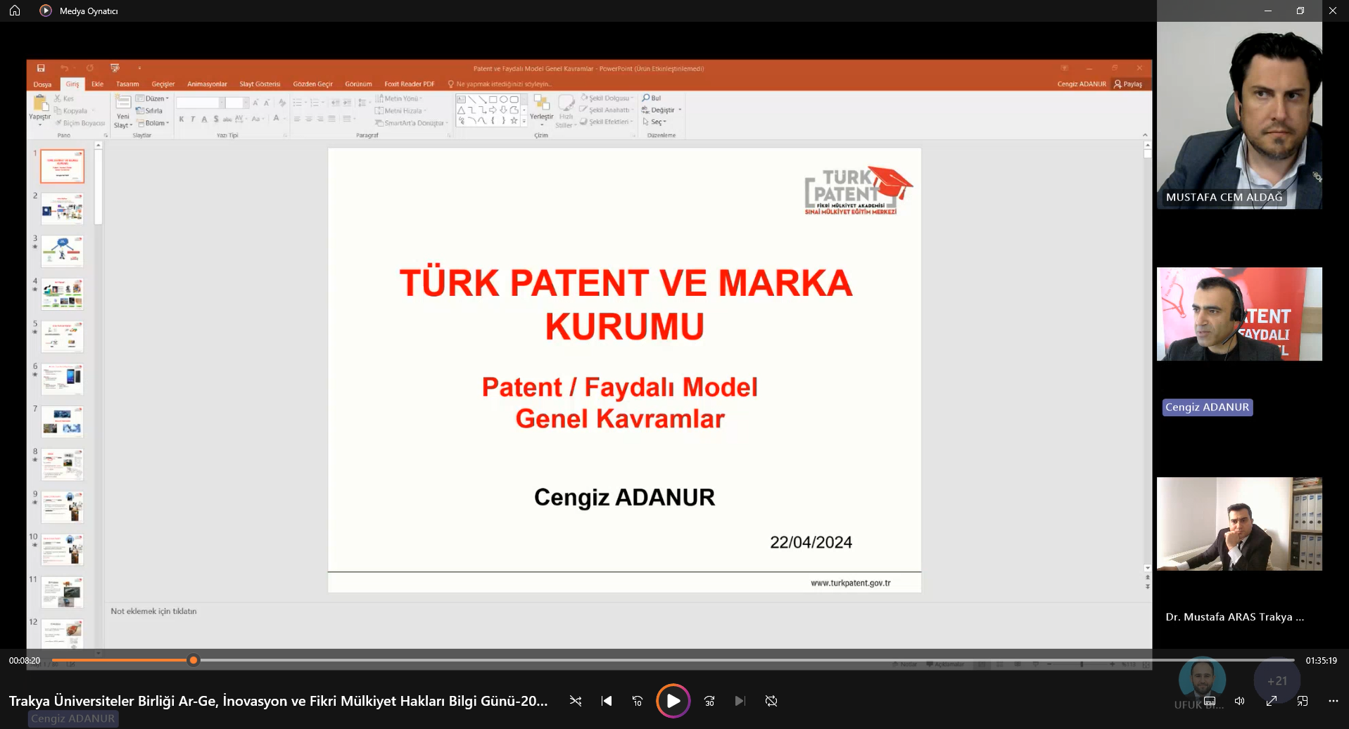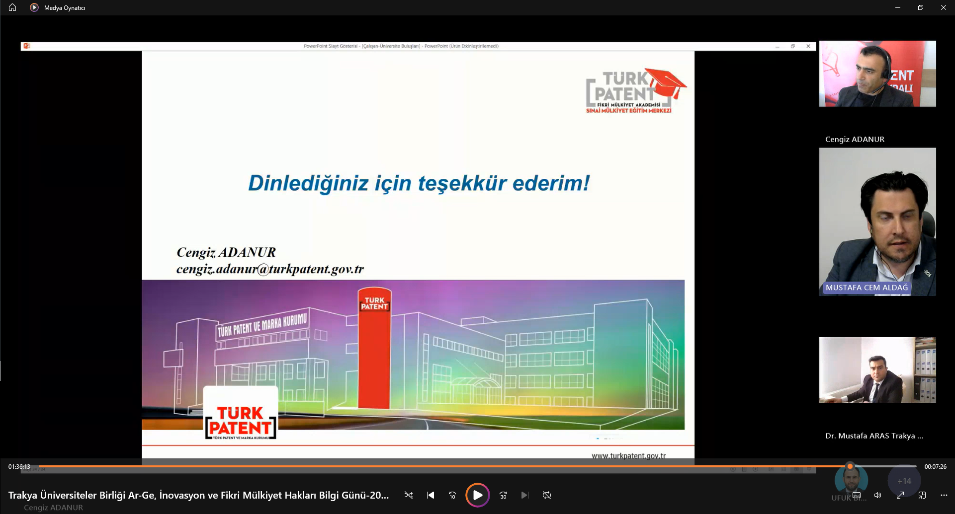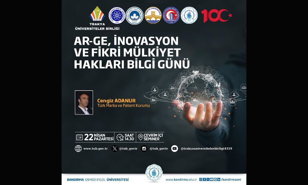 “Ar-Ge, İnovasyon ve Fikri Mülkiyet Hakları Bilgi Günü” Semineri’ne  Trakya Üniversiteler Birliği Genel Sekreteri Dr. Öğr. Üyesi Mustafa ARAS, moderatör olarak Bandırma Onyedi Eylül Üniversitesinden Öğr. Gör. Dr. Mustafa Cem ALDAĞ, sunumları ile Türk Patent ve Marka Kurumundan Cengiz ADANURTrakya Üniversiteler Birliğine üye üniversitelerin yanı sıra ülkemizin önde gelen üniversitelerinde çalışan çok sayıda akademisyen ve öğrenciler katıldı.