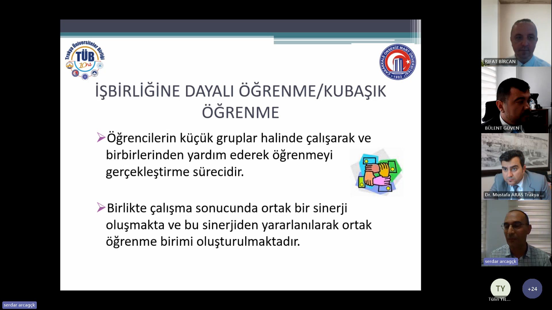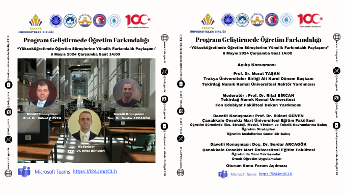 Program Geliştirmede Öğretim Farkındalığı “Yükseköğretimde Öğretim Süreçlerine Yönelik Farkındalık Paylaşımı” Çevrim İçi Semineri’ne Trakya Üniversiteler Birliği Alt Kurul Dönem Başkanı ve Tekirdağ Namık Kemal Üniversitesi Rektör Yardımcısı Prof. Dr. Murat TAŞAN, Trakya Üniversiteler Birliği Genel Sekreteri Dr. Öğr. Üyesi Mustafa ARAS, moderatör olarak Tekirdağ Namık Kemal Üniversitesi Fen edebiyat Fakültesi Dekan Yardımcısı Prof. Dr. Rıfat BİRCAN, sunumları ile Çanakkale Onsekiz Mart Üniversitesi‘nden Prof. Dr. Bülent GÜVEN ve Doç. Dr. Serdar ARCAGÖK, Trakya Üniversiteler Birliğine üye üniversitelerin yanı sıra ülkemizin önde gelen üniversitelerinden program geliştirme alanında çalışan çok sayıda akademisyen ve öğrenciler katıldı.