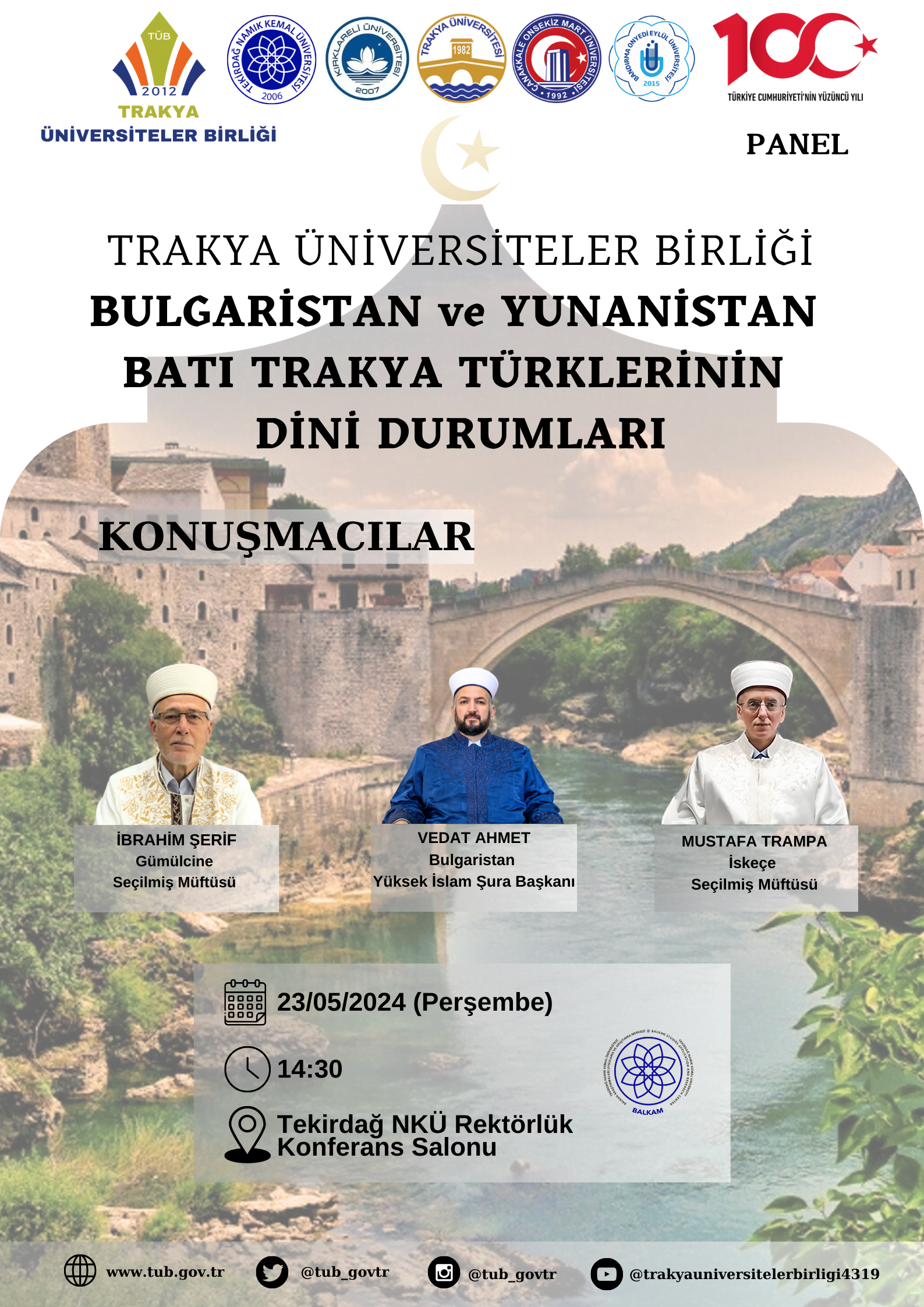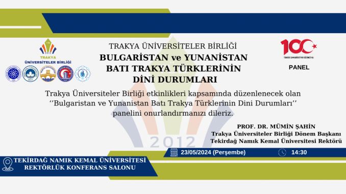 Trakya Üniversiteler Birliği (TÜB) “Bulgaristan ve Yunanistan Batı Trakya Türklerinin Dini Durumları” Paneline Davetlisiniz. Tarih:23.05.2024 21 Mayıs 2024 TÜB DUYURULAR 0 Etkinliklerimizi Takip İçin https://www.tub.gov.tr https://twitter.com/tub_govtr https://www.instagram.com/tub_govtr/ https://www.youtube.com/@trakyauniversitelerbirligi4319 TweetlePaylaşPaylaşPin0 Paylaşımlar