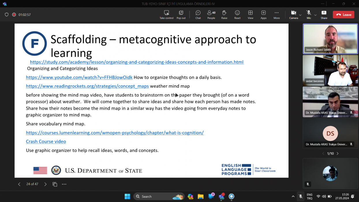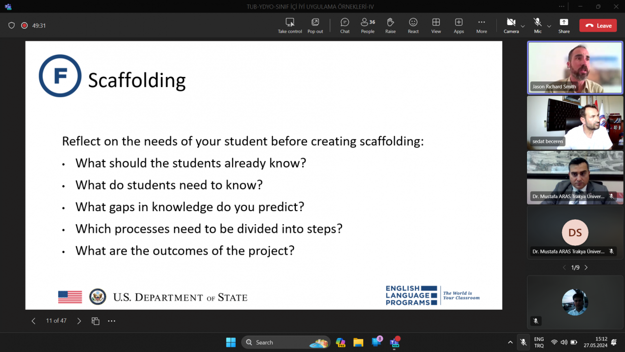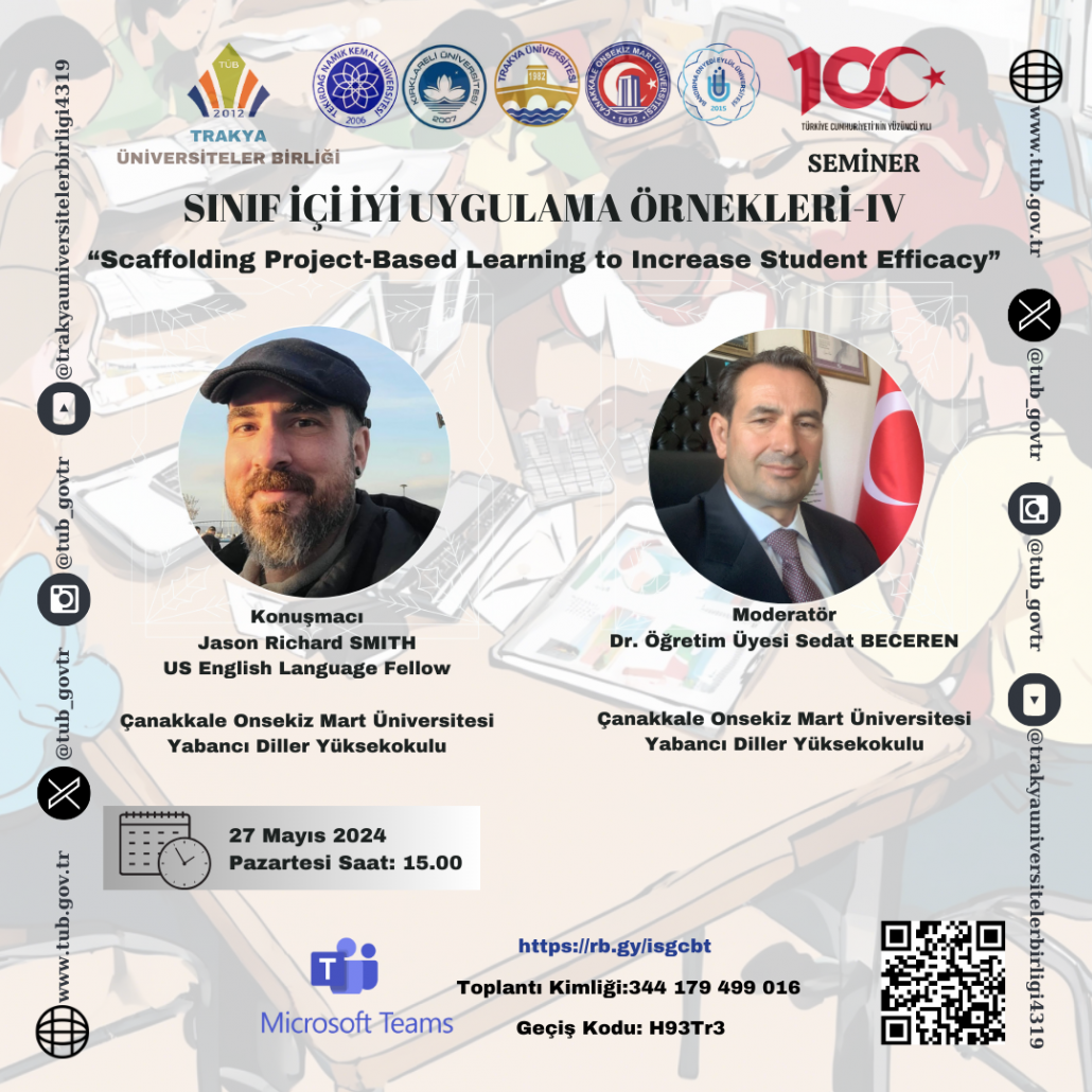 Trakya Üniversiteler Birliği (TÜB) Yabancı Diller Yüksekokulları Alt Çalışma Grubu (YDYO AÇG) tarafından düzenlenen “Sınıf İçi İyi Uygulama Örnekleri” isimli seminer serisinin dördüncüsü olan “Scaffolding Project-Based Learning to Increase Student Efficacy” başlıklı etkinlik, Çanakkale Onsekiz Mart Üniversitesi Yabancı Diller Yüksekokulu tarafından çevrim içi olarak yapıldı.