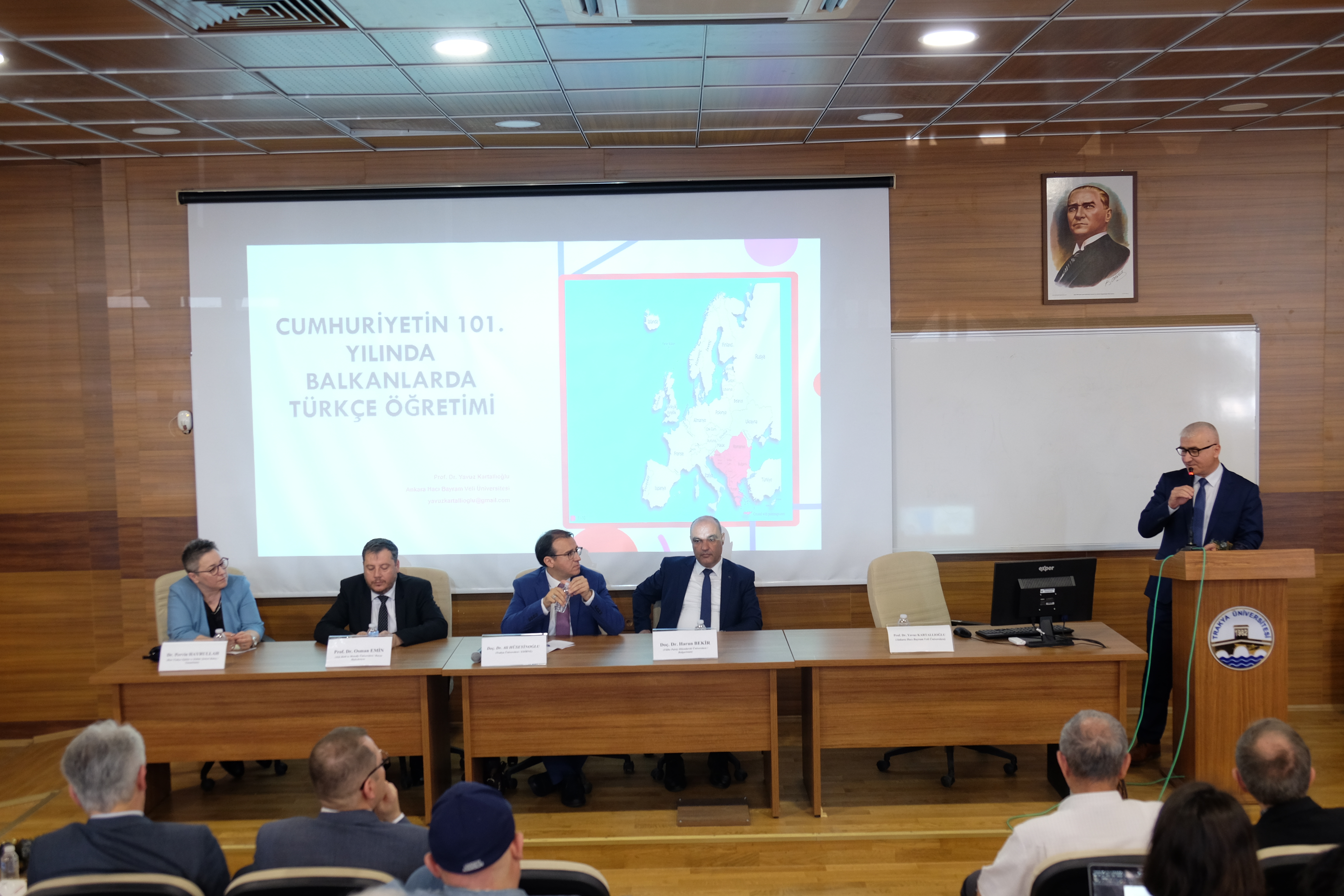 Panel, Balkan Araştırma Enstitüsü Müdürü Prof. Dr. İbrahim Kelağa Ahmet’in açılış konuşması, Üniversitemiz Rektör Yardımcısı Prof. Ahmet Hamdi Zafer’in ana dilinin önemine vurgu yapan selamlama konuşması ve panelistlerin özgeçmişlerinin okunarak sırasıyla kürsüye davet edilmelerinin ardından başladı. İlk panelist Prof. Dr. Yavuz Kartallıoğlu “Cumhuriyetin 101. Yılında Balkanlar’da Türkçe Öğretimi” konulu konuşmasının ilk bölümünde Türkiye Cumhuriyeti’nin Türkçe öğretimini dünyaya yayma faaliyetlerinden bahsetti. 1999-2010 yılları arasında Türkiye Türkçesinin dünyaya yayılması için TİKA’nın ilk Türkoloji faaliyetlerini dünya haritası üzerinde göstererek bu faaliyetlerin bahse konu yıllarda yüz yüze eğitim yöntemiyle Hindistan, Çin, Moğolistan, Afganistan, Belarus, Ukrayna, Suriye, Estonya, Letonya, Arnavutluk, Bosna Hersek, Slovakya ve Kosova’da gerçekleştirildiğini ifade etti. Devamında harita üzerinde dünyanın her köşesini içine alacak bir yaygınlıkta Yunus Emre Enstitüsü ve Maarif Vakfı ve Milli Eğitim Bakanlığı tarafından yüz yüze Türkçe öğretiminin yürütüldüğü ülkeleri gösterdi ve konuşmasının devamında Balkanlar’daki Türkçe faaliyetlerine odaklandı. İlk olarak Kosova’dan başlayarak Kosova’da mevcut resmî dillerden biri olan Türkçe ile eğitim almanın mümkün olduğunu, ülkedeki Türk nüfusun yoğunlukta olduğu bölgelerdeki ilk ve orta dereceli okullarda ana dilinde (Türkçe) eğitimin mevcut olduğunu ve Türkiye Cumhuriyeti’nin de bu okullarda eğitim veren öğretmenlere çeşitli destekler verdiğini ve Kosova Üniversitelerindeki Türkoloji Bölümlerinde Türkçe öğretmeni yetiştirildiğini belirtti.