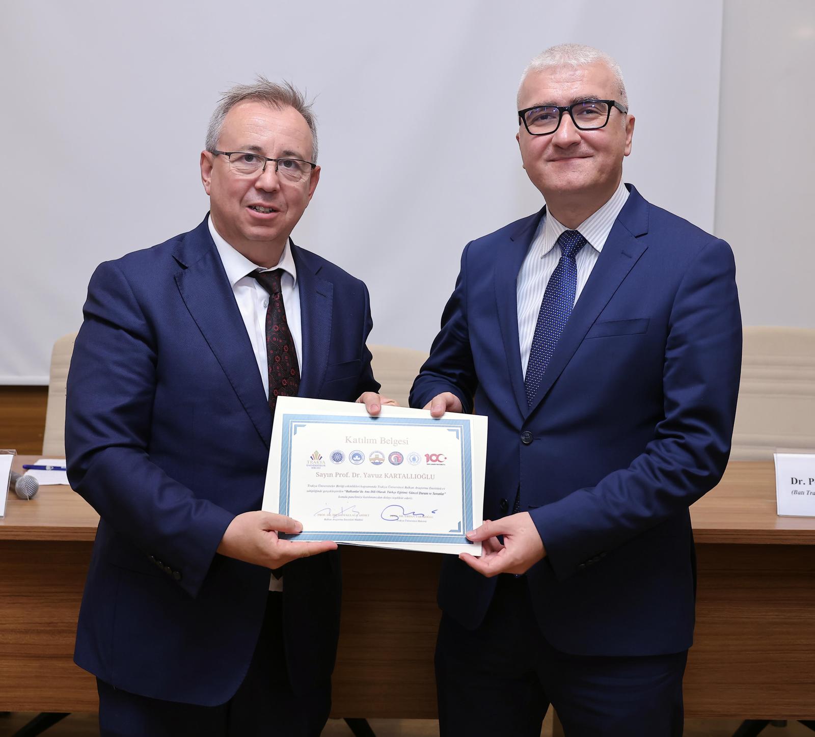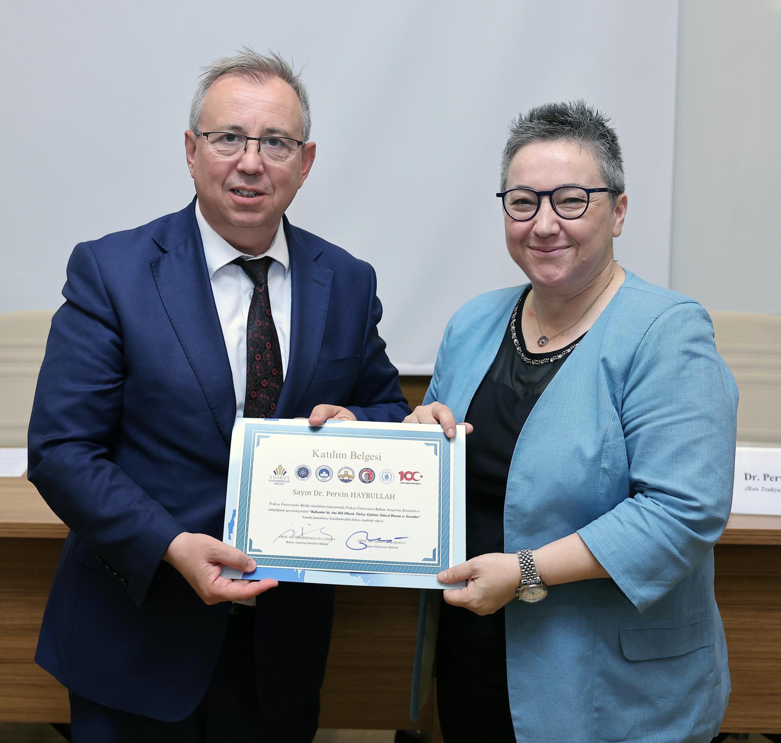 Trakya Üniversitesi Rektörümüz Prof. Dr. Erhan Tabakoğlu, yüksek öğrenim anlamında Türkçeye hizmet ettiğini ve Balkan coğrafyasından Üniversitelerimize gelen Türk öğrencilerin bu sayede dillerini de ileri bir noktaya taşıdıklarını ve kültürlerini de muhafaza ettiklerini belirterek bu tür toplantıları Türkiye Maarif Vakfı ve Yunus Emre Enstitüsünün katkılarıyla geleneksel hale getirmeyi hedeflediklerini belirttikten sonra katılımcılara bir kez daha teşekkür ederek katılım belgelerini verdi ve panel sona erdi.