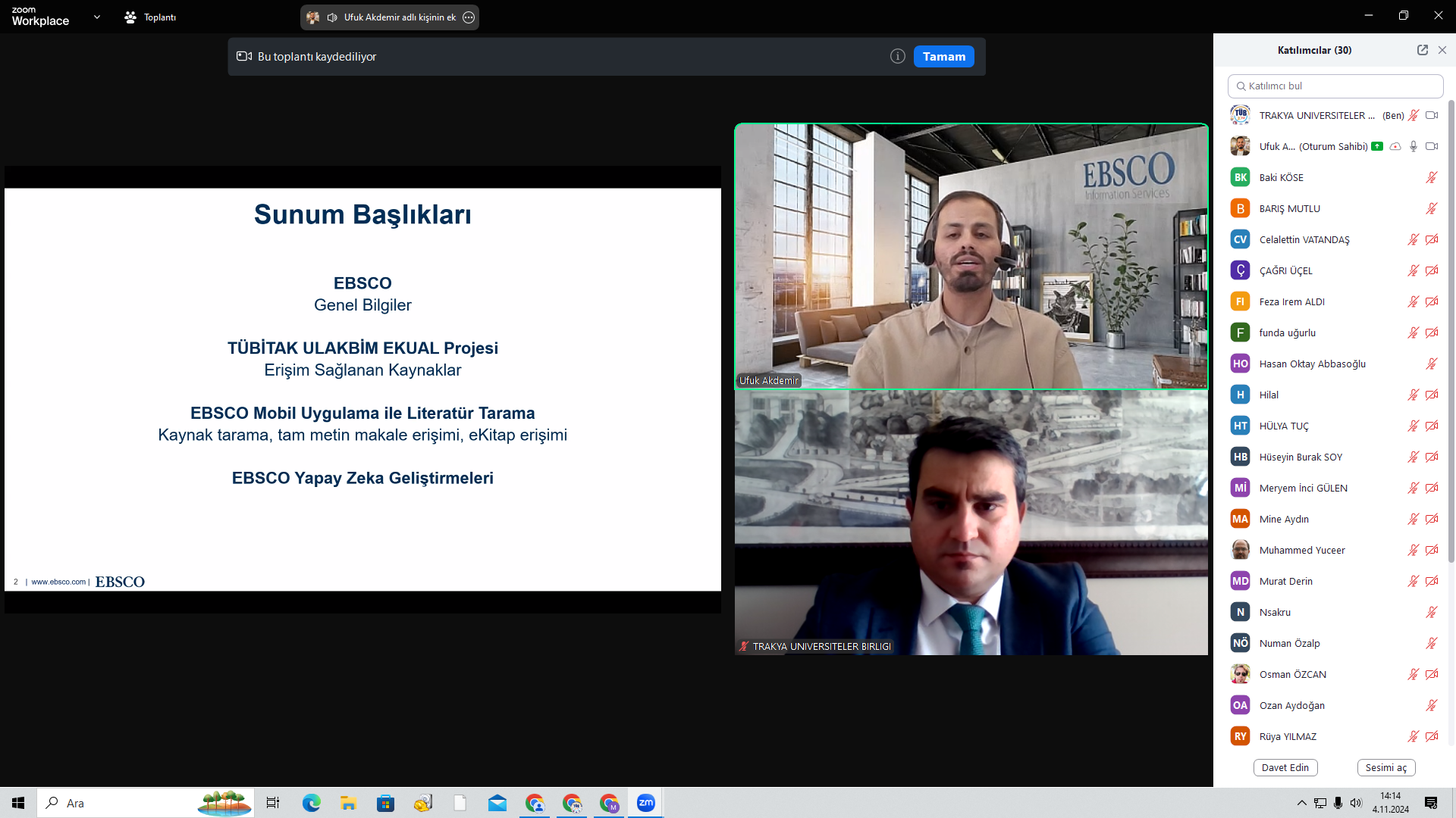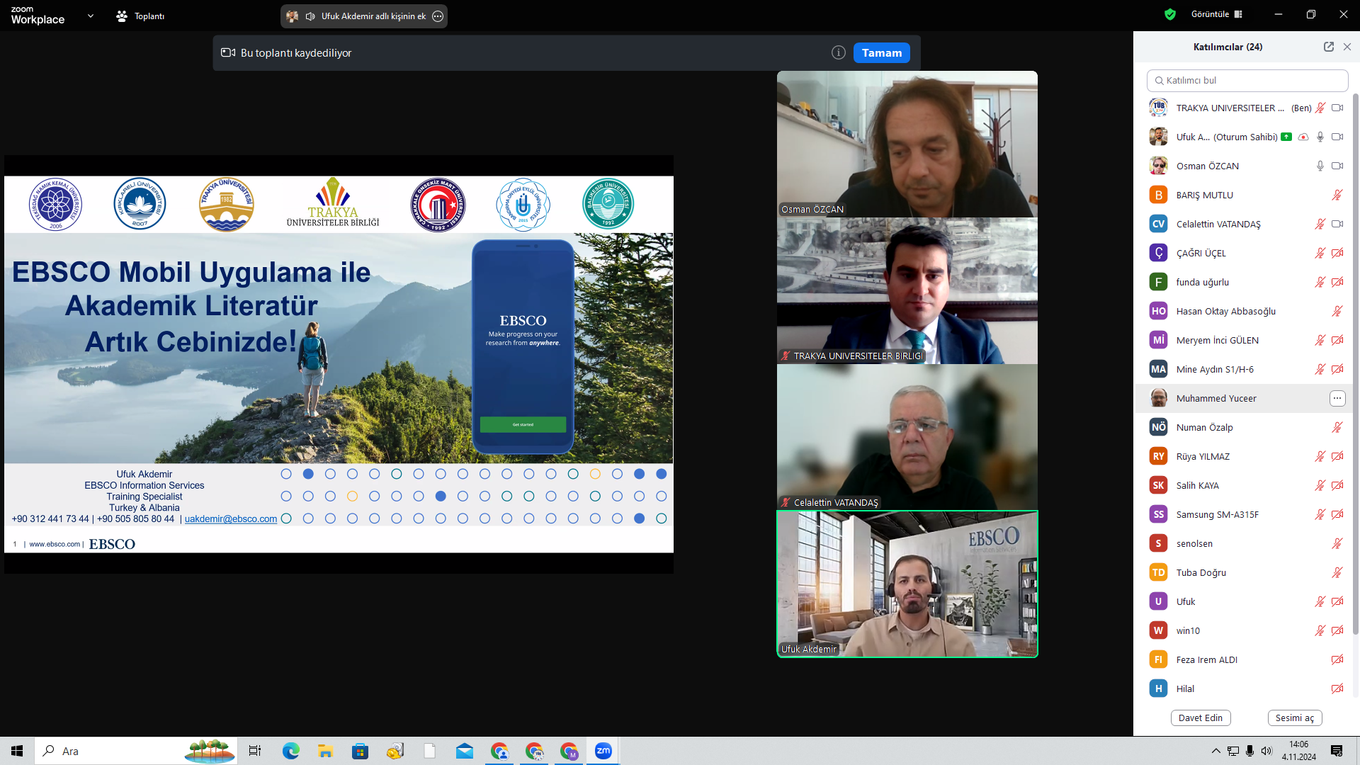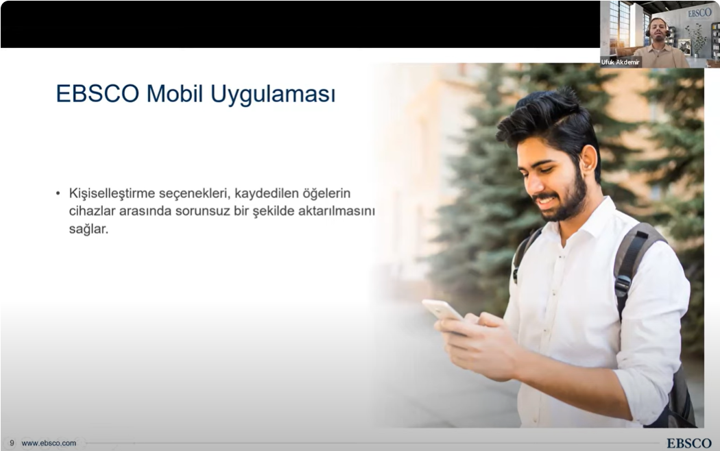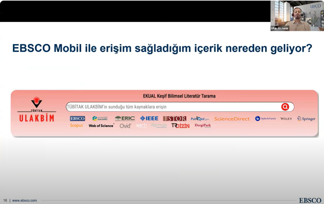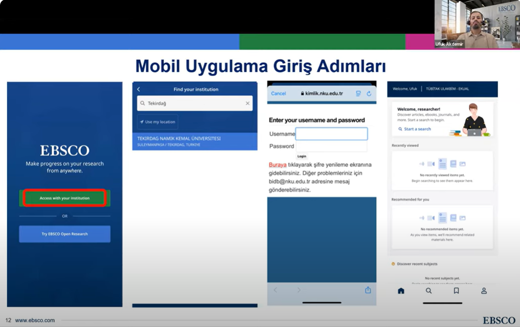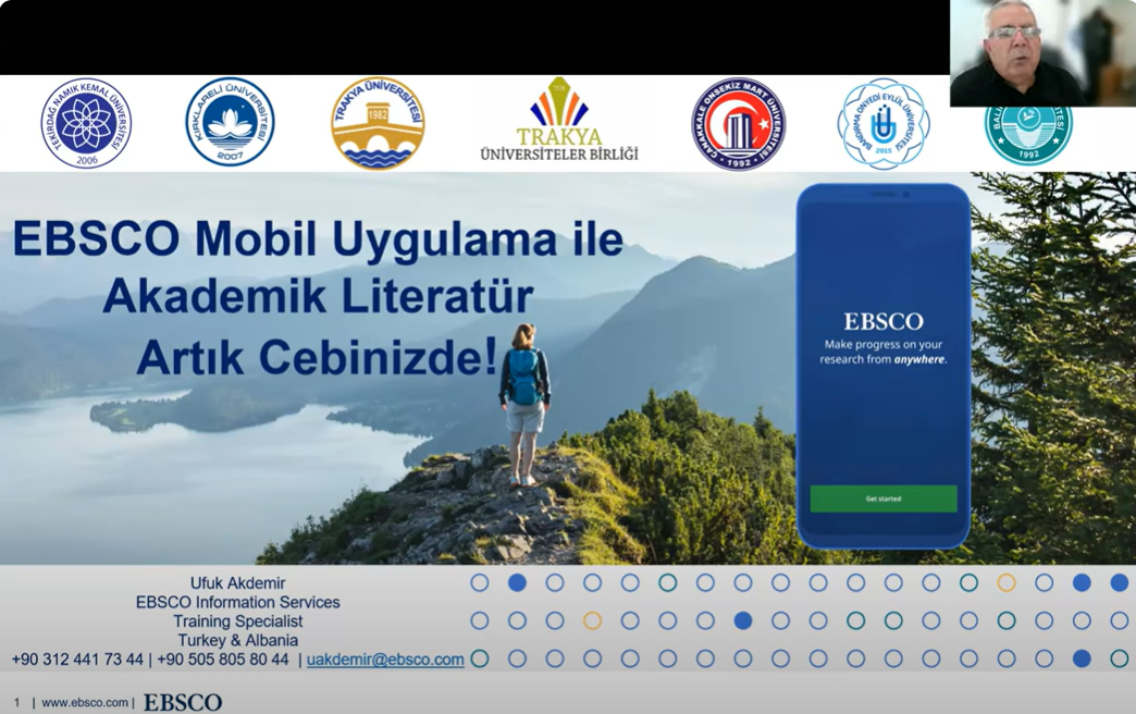 Trakya Üniversiteler Birliği Kütüphane ve Dokümantasyon AÇG tarafından Elektronik Kaynak Eğitimleri serisinin ikincisi 04 Kasım 2024 tarihinde düzenlendi. Tekirdağ Namık Kemal Üniversitesi Rektör Yardımcısı Prof. Dr. Celalettin VATANDAŞ‘ın açılış konuşmalarının ardından, EBSCO veritabanları içeriğinin kullanımı hakkında eğitim sorumlusu Ufuk Akdemir tarafından sunum gerçekleştirildi. Önemli ölçüde katılımın sağlandığı toplantıda, Trakya Üniversiteler Birliği üniversitelerinin erişiminde olan EBSCO veri tabanlarına mobil uygulamalar üzerinden erişim süreçleri aktarıldı.