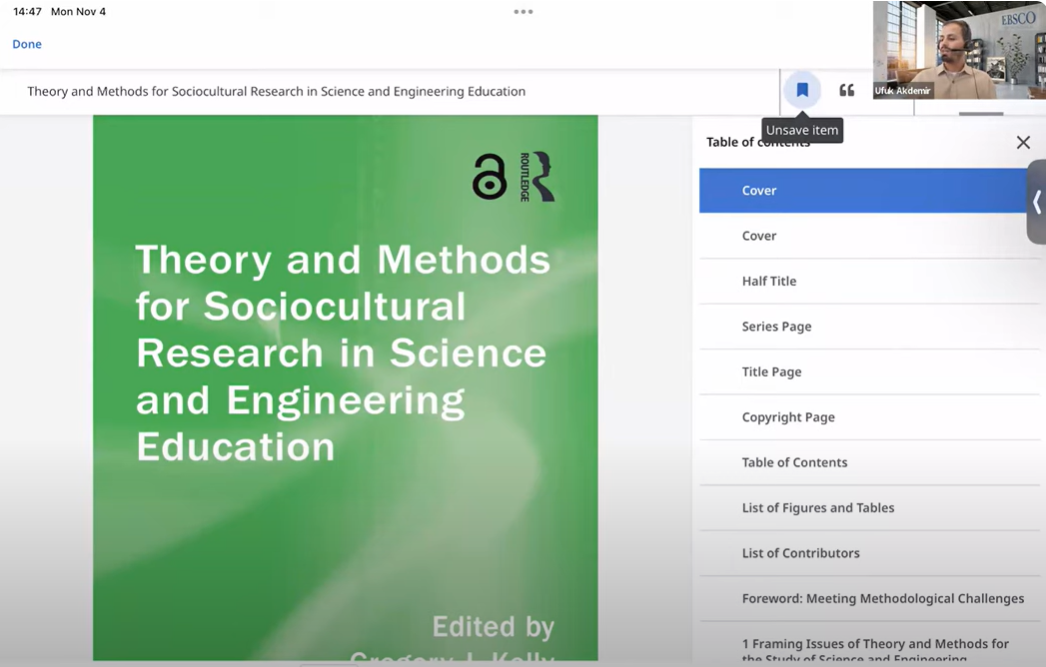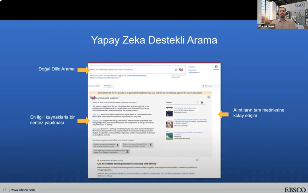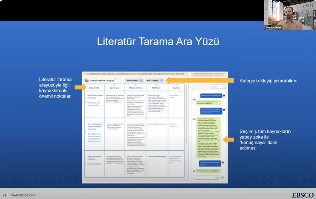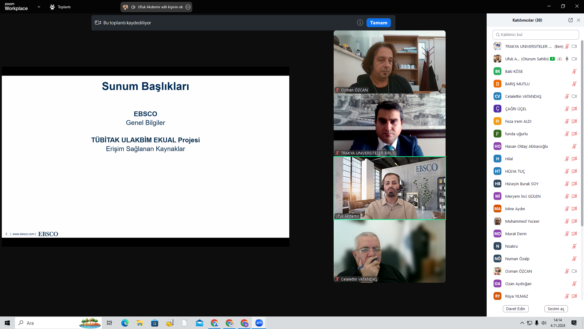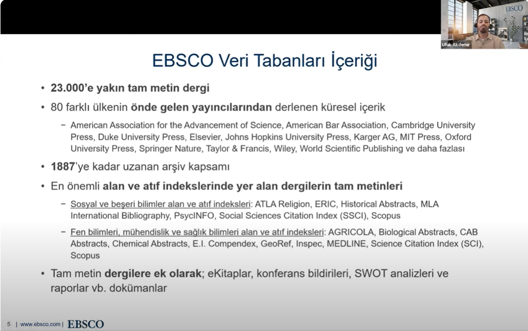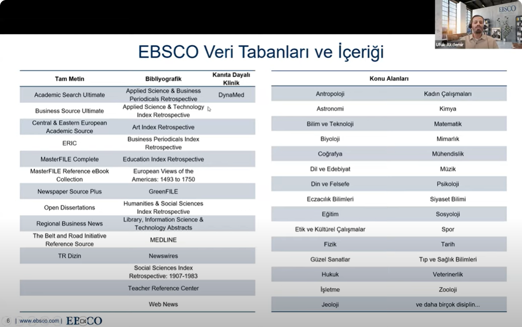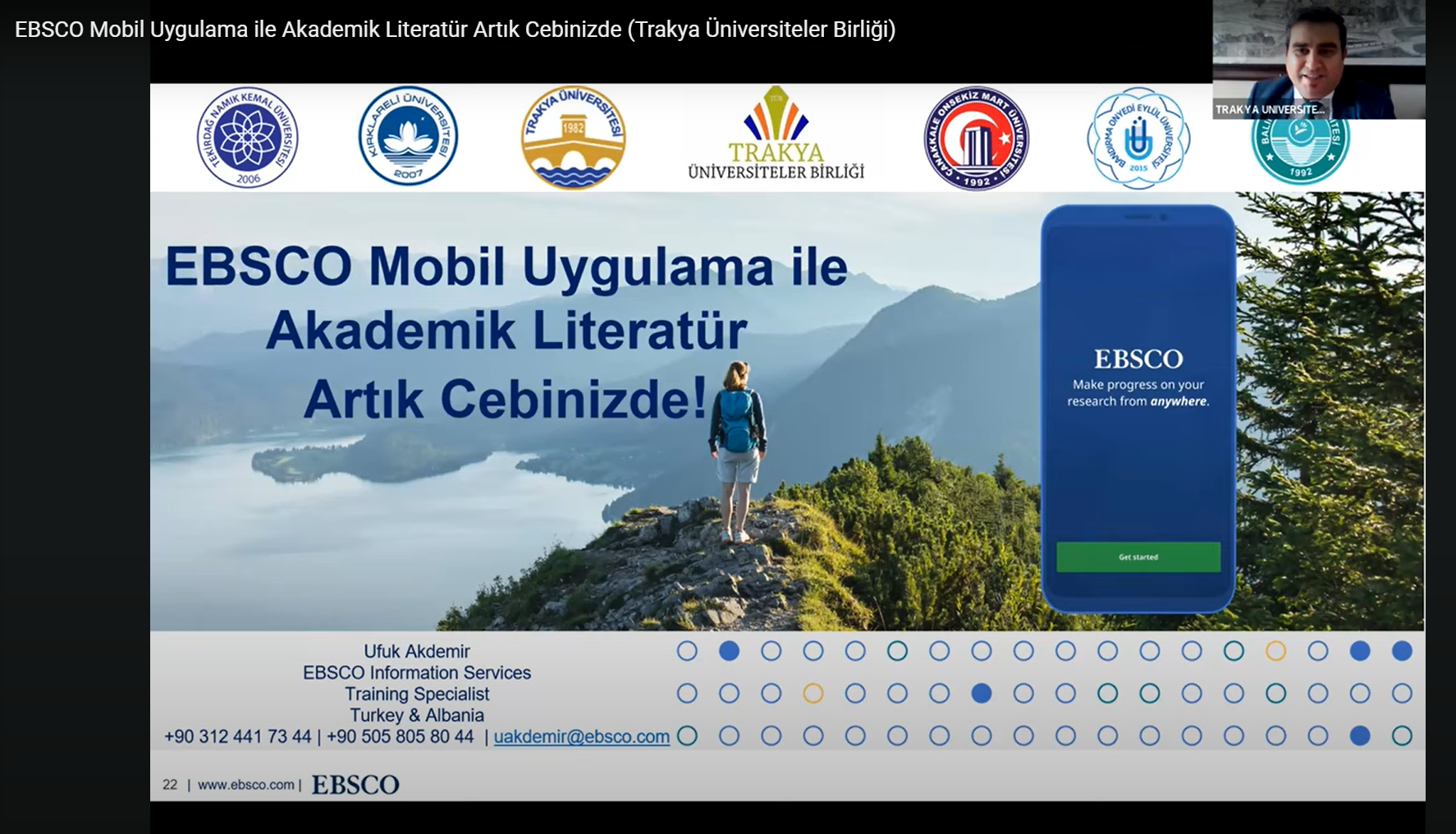 Trakya Üniversiteler Birliği Kütüphane ve Dokümantasyon AÇG tarafından Elektronik Kaynak Eğitimleri serisinin ikincisi 04 Kasım 2024 tarihinde düzenlendi. Tekirdağ Namık Kemal Üniversitesi Rektör Yardımcısı Prof. Dr. Celalettin VATANDAŞ‘ın açılış konuşmalarının ardından, EBSCO veritabanları içeriğinin kullanımı hakkında eğitim sorumlusu Ufuk Akdemir tarafından sunum gerçekleştirildi. Önemli ölçüde katılımın sağlandığı toplantıda, Trakya Üniversiteler Birliği üniversitelerinin erişiminde olan EBSCO veri tabanlarına mobil uygulamalar üzerinden erişim süreçleri aktarıldı.