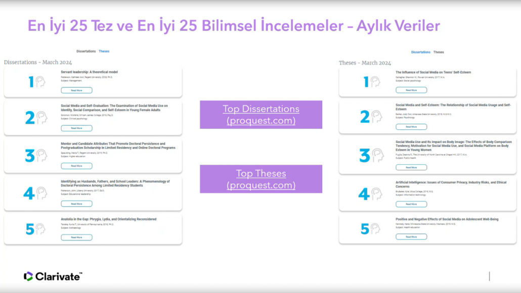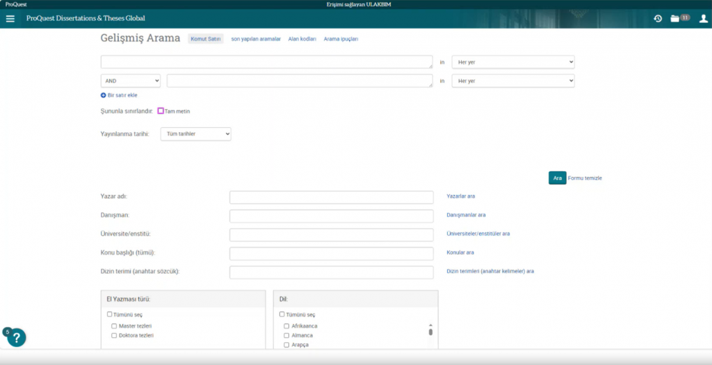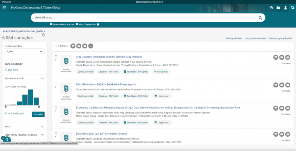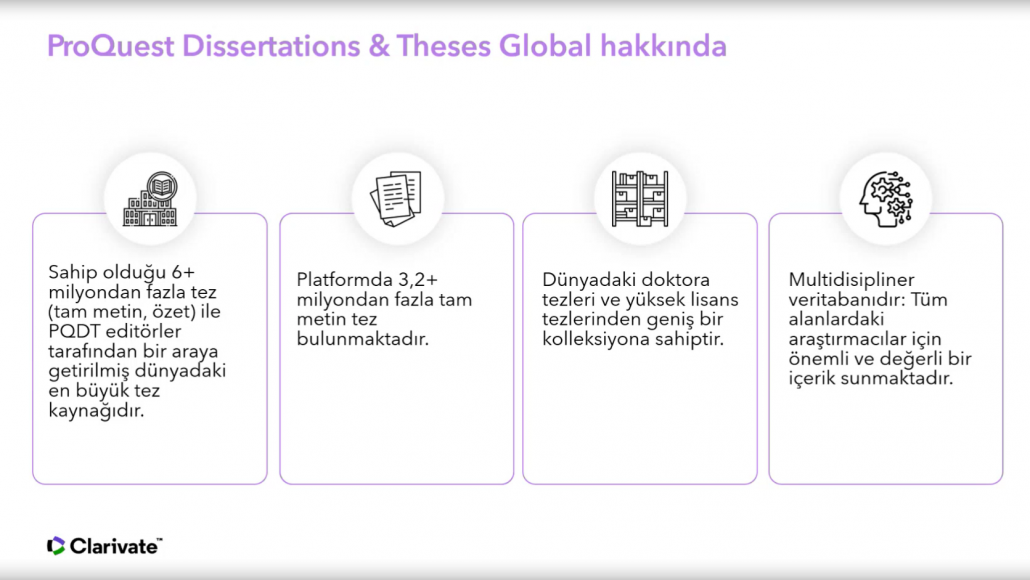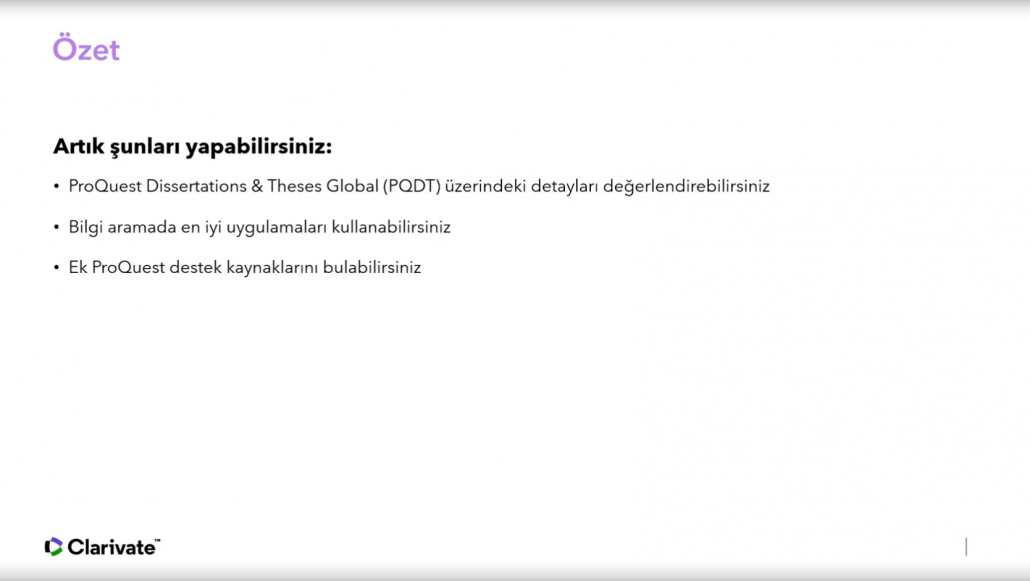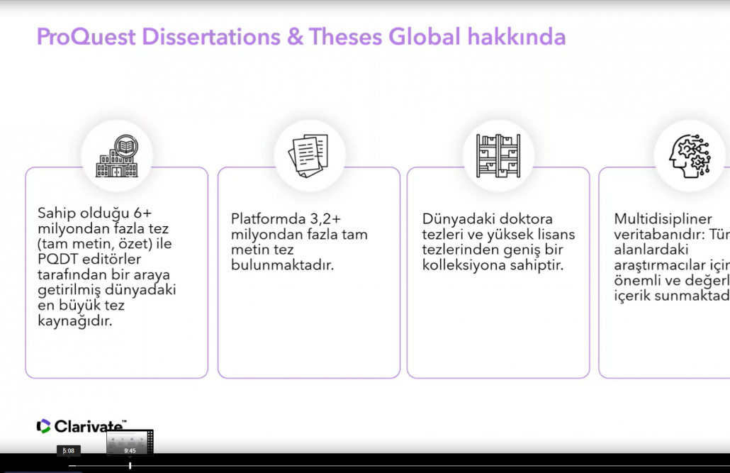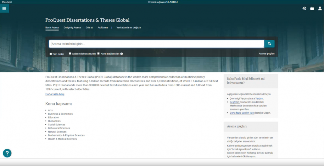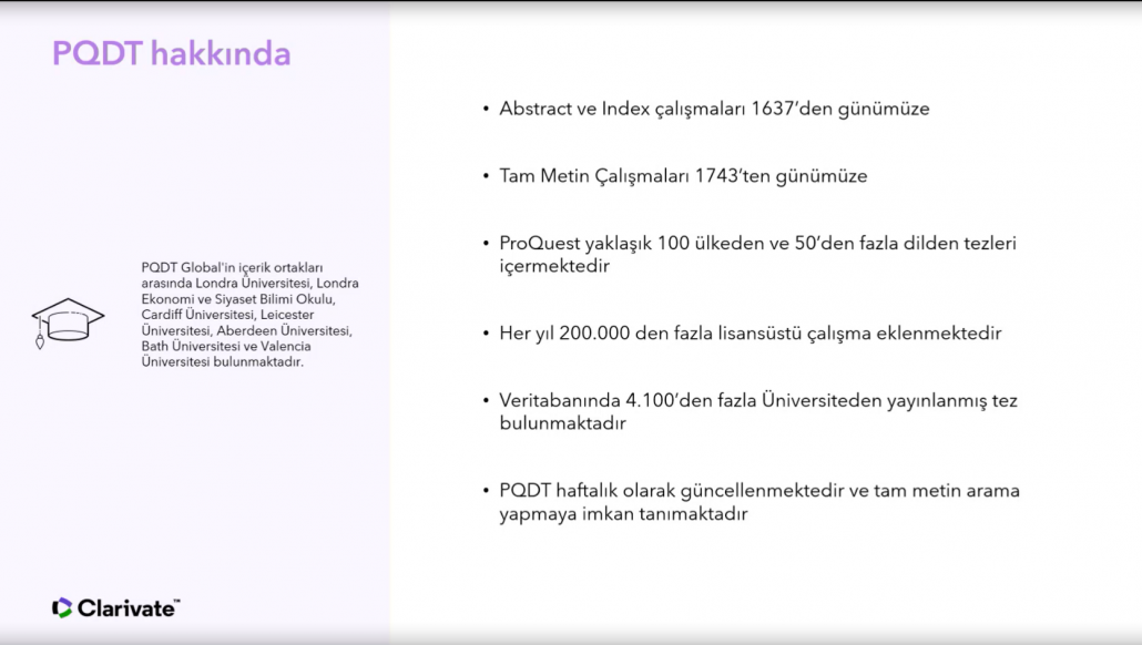 Ulakbim tarafından ülkemizdeki tüm üniversitelerin erişimine açılan ve içeriğinde 3,5 milyonun üzerinde tam metin olmak üzere toplam 5 milyonun üzerinde, multidisipliner alanlarda yüksek lisans ve doktora tezlerine erişim imkanı sağlayan ProQuest Disertations and Thesis veritabanında, kaynakların etkin şekilde kullanılmasına olanak tanıyan ipuçları katılımcılar ile paylaşıldı.