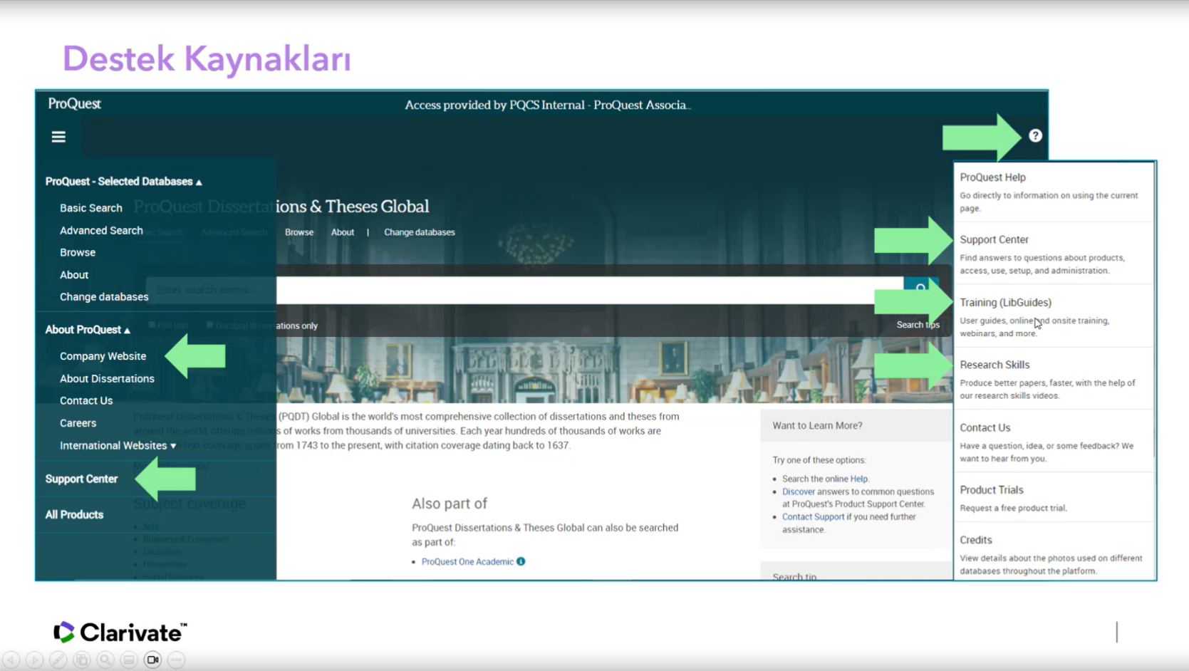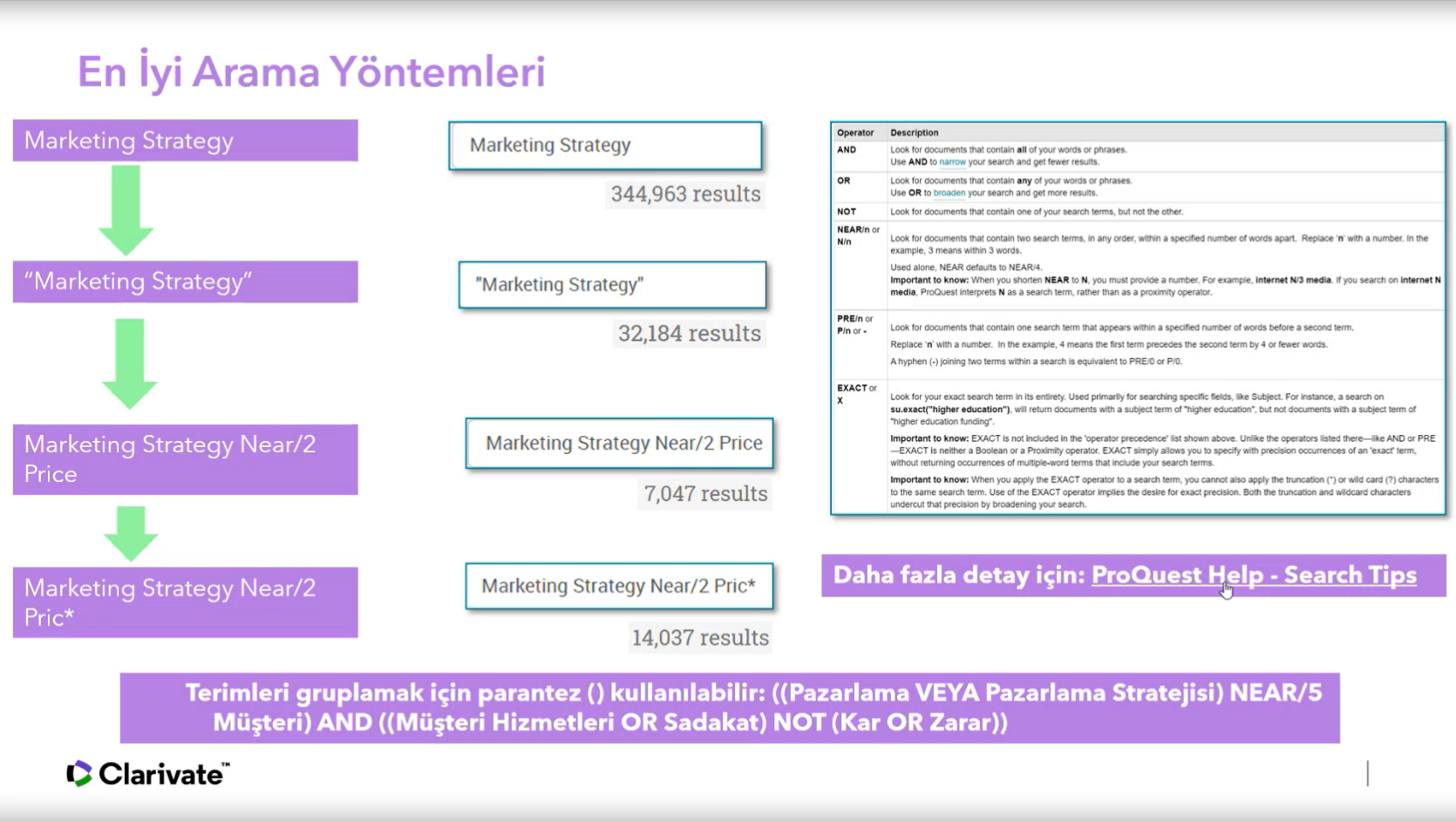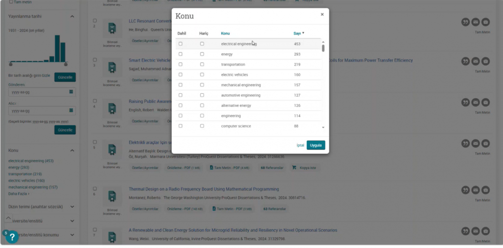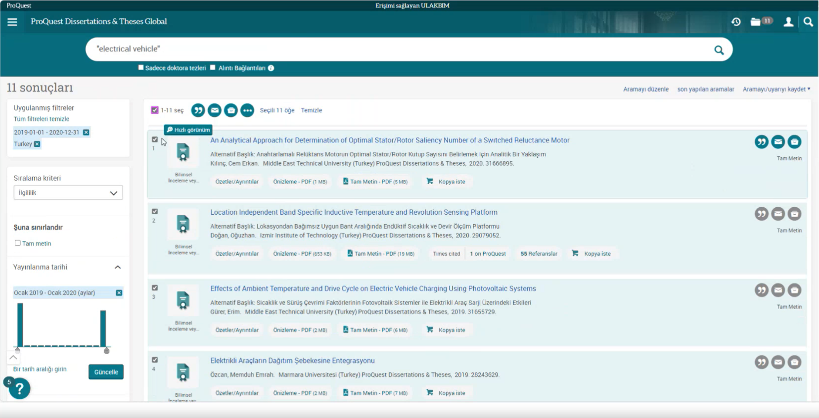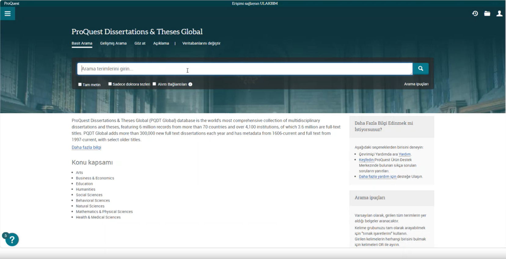 Ulakbim tarafından ülkemizdeki tüm üniversitelerin erişimine açılan ve içeriğinde 3,5 milyonun üzerinde tam metin olmak üzere toplam 5 milyonun üzerinde, multidisipliner alanlarda yüksek lisans ve doktora tezlerine erişim imkanı sağlayan ProQuest Disertations and Thesis veritabanında, kaynakların etkin şekilde kullanılmasına olanak tanıyan ipuçları katılımcılar ile paylaşıldı.