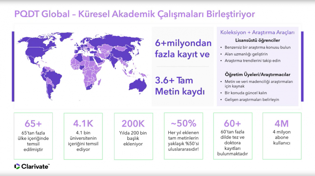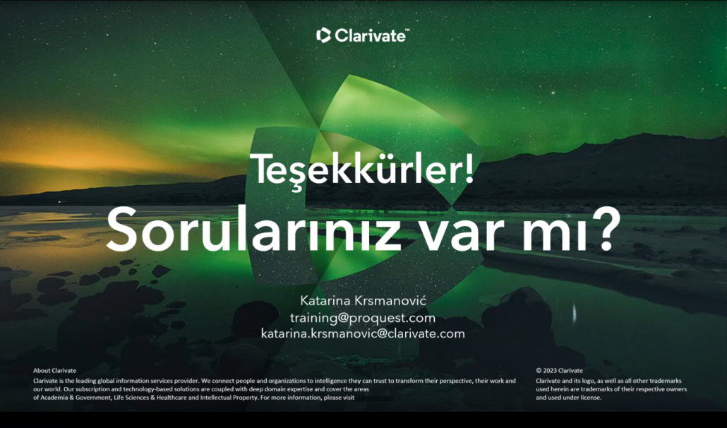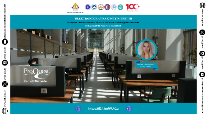 ProQuest eğitim sorumlusu Katarina Krsmanović tarafından geçekleştirilen sunumda, PQDT Global veritabanın içeriği, literatür arama, platform kullanımı, hesap oluşturma, arama bildirimleri ayarlama vb. fonksiyonlar hem sunum hem de demo şeklinde gösterildi.
