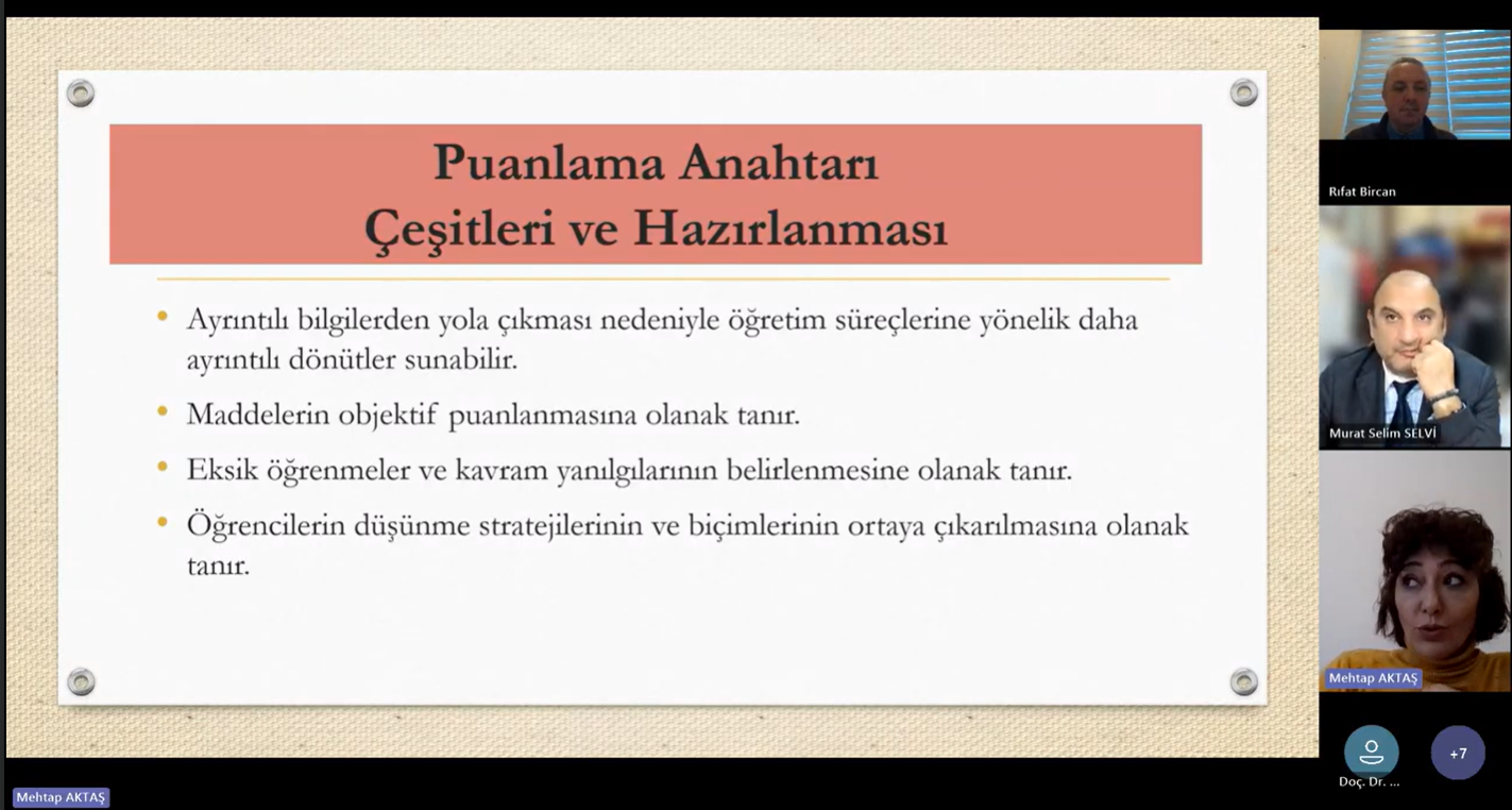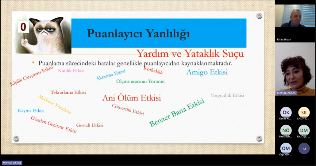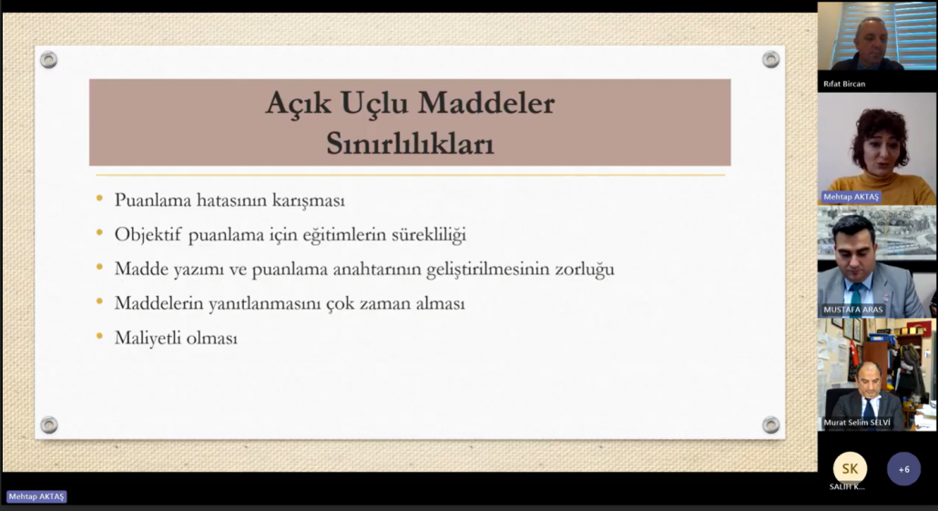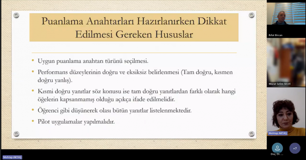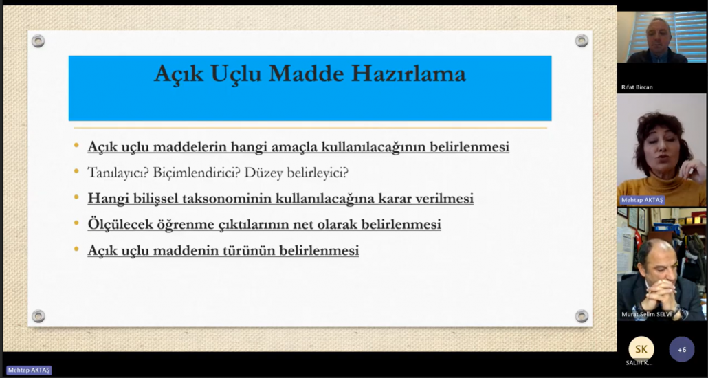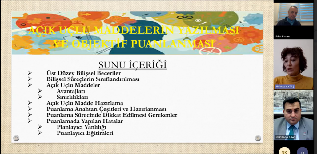 Dr. Öğr. Üyesi Mehtap AKTAŞ “Açık Uçlu Maddelerin Yazılması ve Objektif Puanlanması” sunumunu gerçekleştirdi. “Üst Düzey Bilişsel Beceriler, Bilişsel Süreçlerin Sınıflandırılması, Açık Uçlu Maddelerin Avantajları ve Sınırlılıkları, Açık Uçlu Madde Hazırlama, Puanlama Anahtarı Çeşitleri ve Hazırlanması, Puanlama Sürecinde Dikkat Edilmesi Gerekenler, Puanlamada Yapılan Hatalar, Planlayıcı Yanlılığı, Puanlayıcı Eğitimleri” konularında bilgilendirmeler yapıldı. Sunum sonrasında ise ilgili konulara yönelik öğretim elemanlarından gelen sorular cevaplandırıldı.