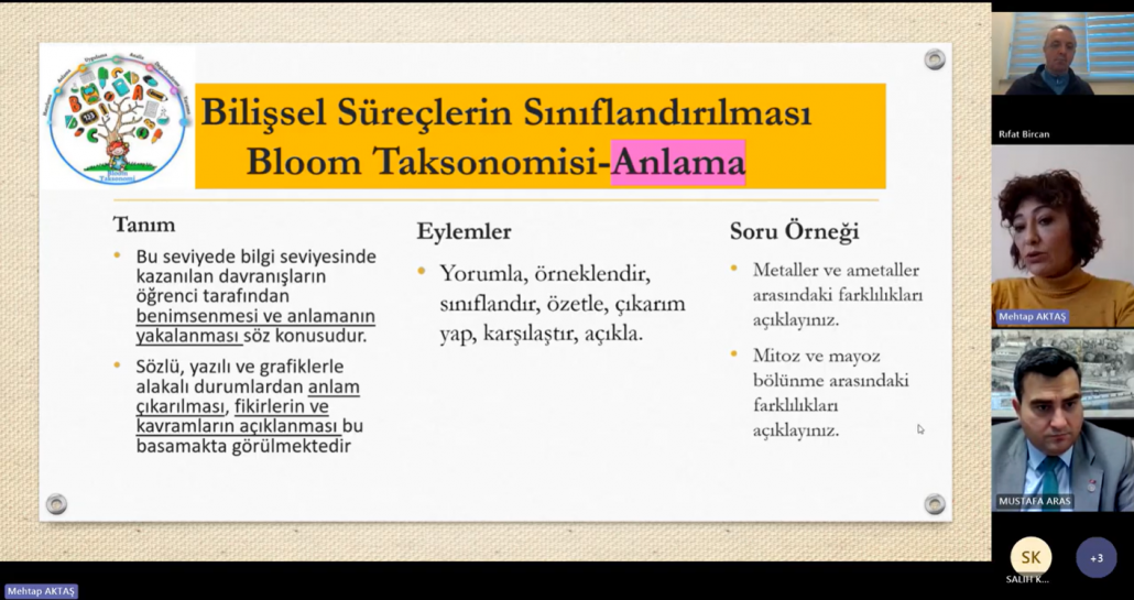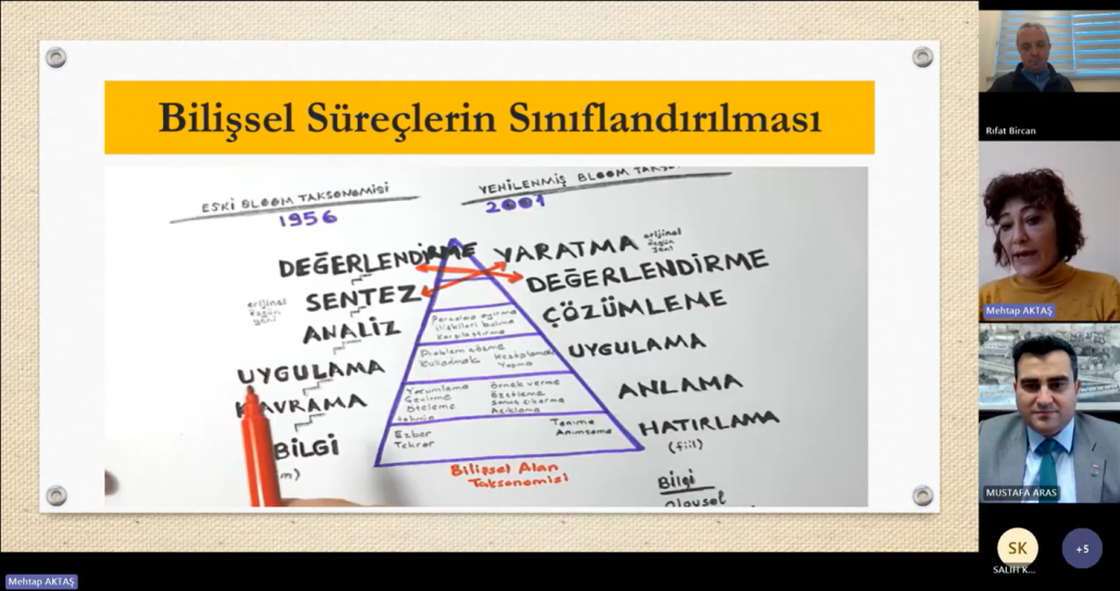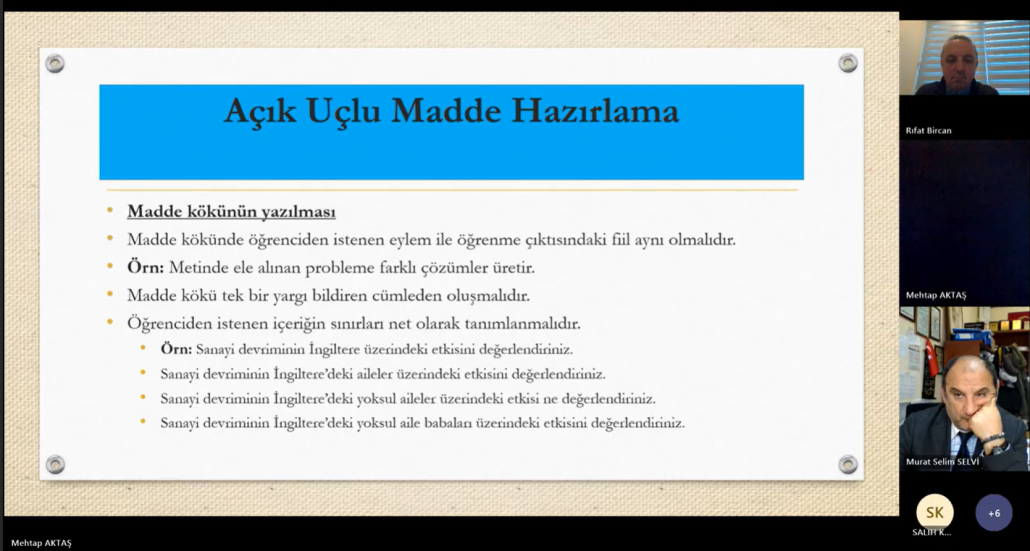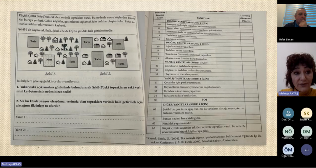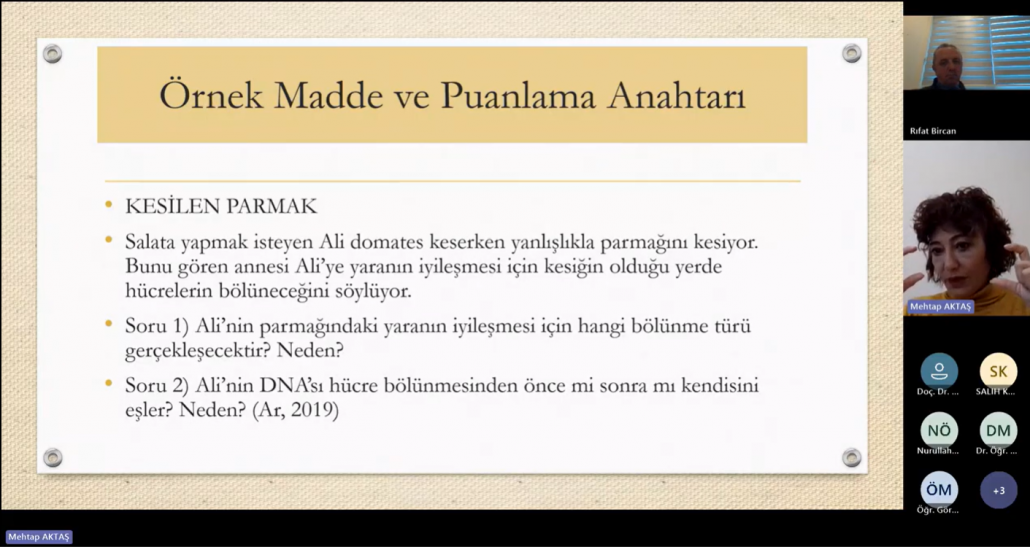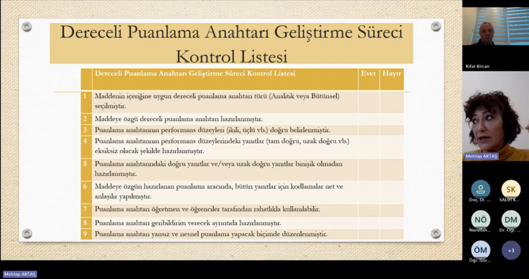 Dr. Öğr. Üyesi Mehtap AKTAŞ “Açık Uçlu Maddelerin Yazılması ve Objektif Puanlanması” sunumunu gerçekleştirdi. “Üst Düzey Bilişsel Beceriler, Bilişsel Süreçlerin Sınıflandırılması, Açık Uçlu Maddelerin Avantajları ve Sınırlılıkları, Açık Uçlu Madde Hazırlama, Puanlama Anahtarı Çeşitleri ve Hazırlanması, Puanlama Sürecinde Dikkat Edilmesi Gerekenler, Puanlamada Yapılan Hatalar, Planlayıcı Yanlılığı, Puanlayıcı Eğitimleri” konularında bilgilendirmeler yapıldı. Sunum sonrasında ise ilgili konulara yönelik öğretim elemanlarından gelen sorular cevaplandırıldı.