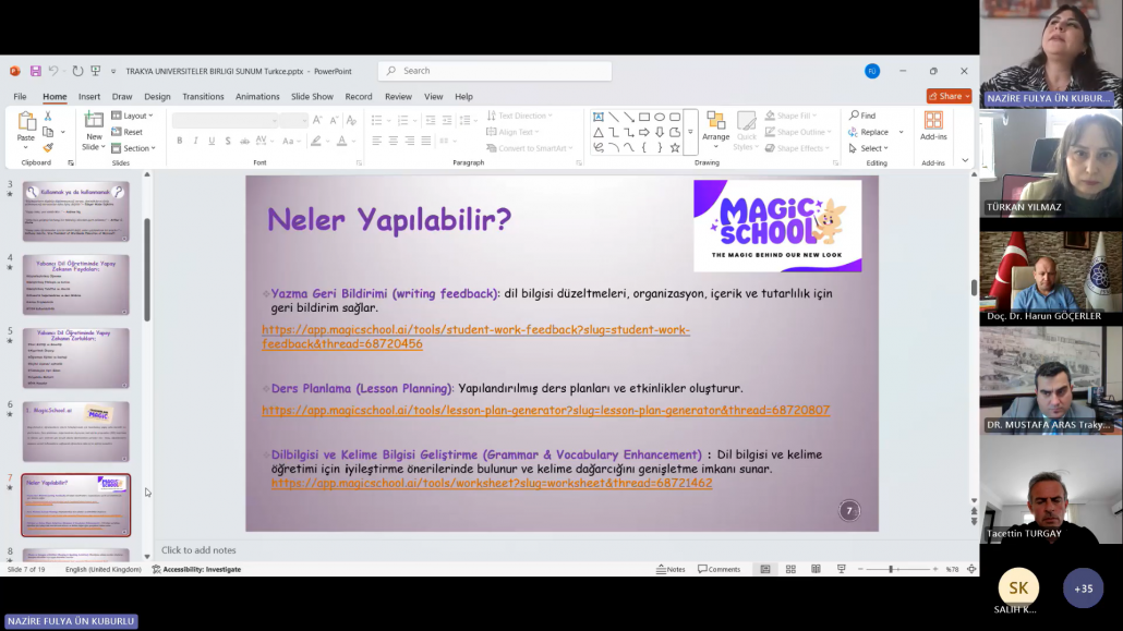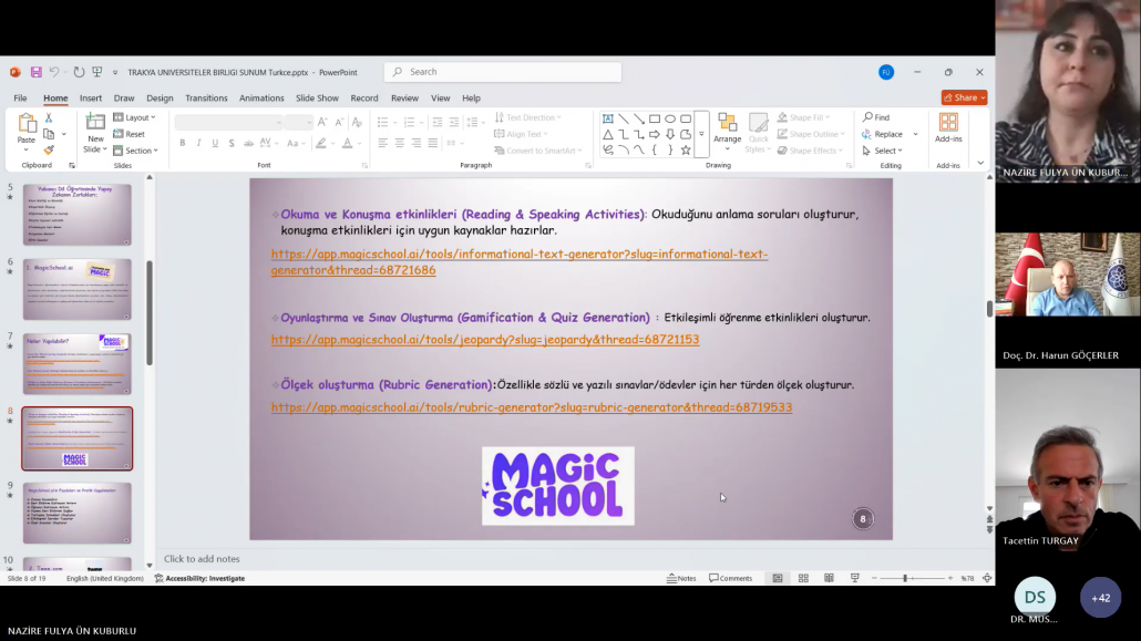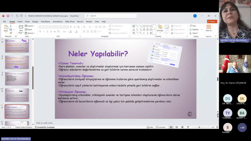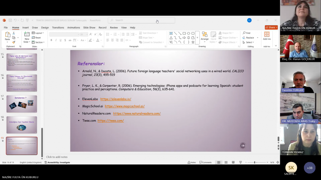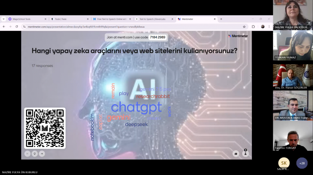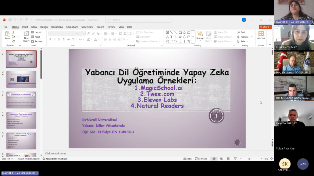 Trakya Üniversiteler Birliği (TÜB) Yabancı Diller Yüksekokulları Alt Çalışma Grubu (YDYO AÇG) tarafından düzenlenen “Sınıf İçi İyi Uygulama Örnekleri” seminer serisinin on ikincisi, “Yabancı Dil Öğretiminde Yapay Zekâ Uygulama Örnekleri” başlığıyla 14 Nisan 2025 tarihinde çevrim içi olarak gerçekleştirilmiştir. Trakya Üniversiteler Birliği Genel Sekreteri Dr. Öğr. Üyesi Mustafa ARAS açılış konuşmalarının ardından etkinliğe Kırklareli Üniversitesi Yabancı Diller Yüksekokulu Müdürü Doç. Dr. Tacettin TURGAY‘ın moderatörlüğünde Öğr. Gör. Nazire Fulya ÜN KUBURLU ‘nun yapay zekâ destekli uygulamaların yabancı dil öğretiminde kullanımına dair bir sunumu ile devam edilmiştir. Sunumda, yapay zekâ teknolojilerinin öğretmenlerin materyal geliştirme, ders planlama, ölçme-değerlendirme ve öğrenci etkileşimi gibi süreçleri nasıl kolaylaştırdığına değinilmiş ve çeşitli uygulama örnekleri sunulmuştur. Ayrıca, yapay zekâ uygulamalarının zaman tasarrufu sağlaması, kişiselleştirilmiş içerikler oluşturulmasına olanak tanıması ve sınıf içi etkileşimi artırması gibi avantajları vurgulanmış ve çeşitli uygulama örnekleri sunulmuştur.