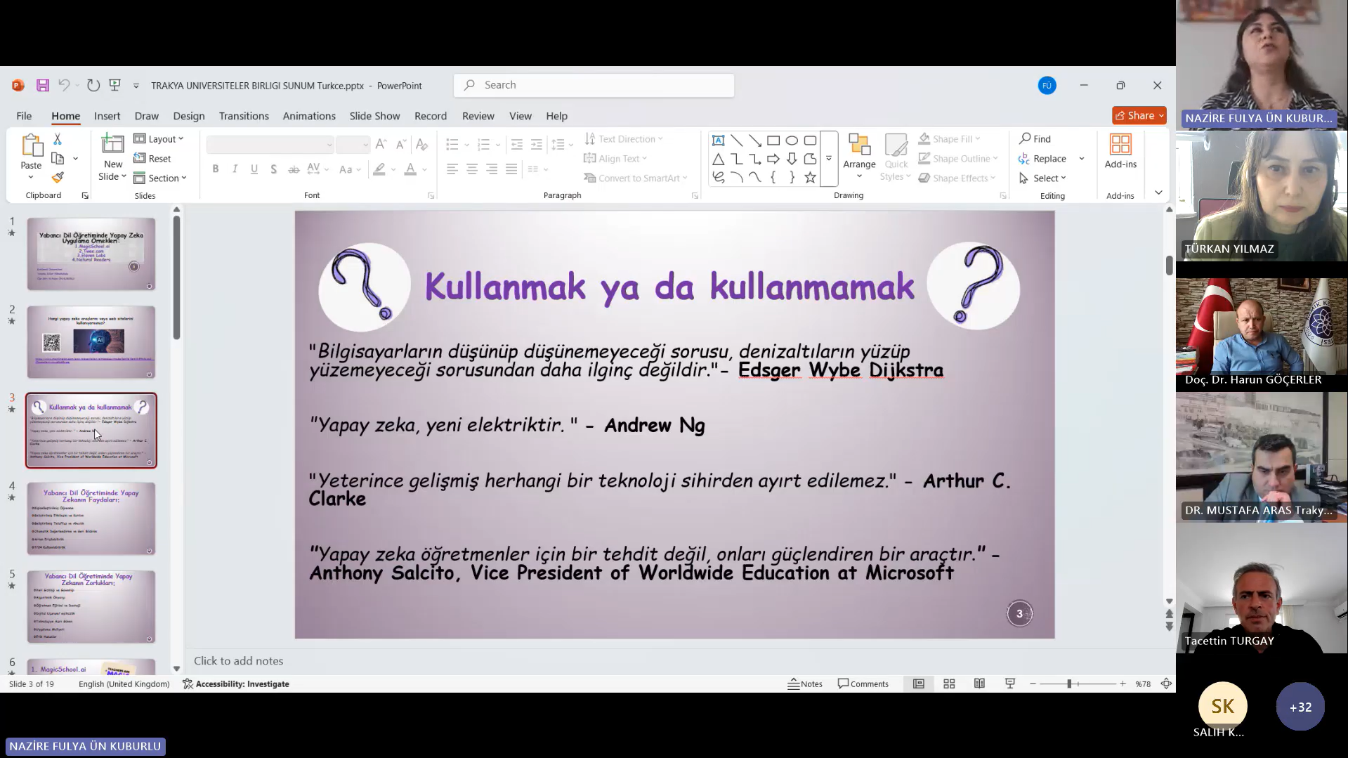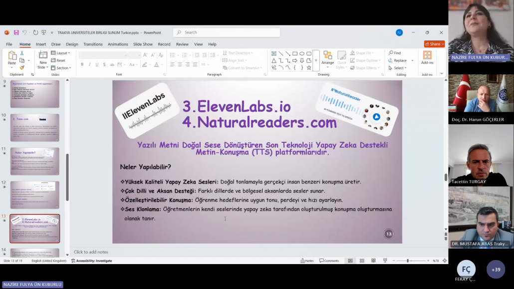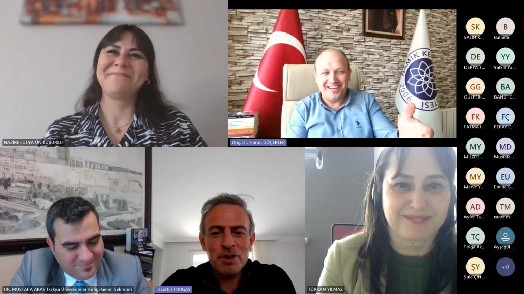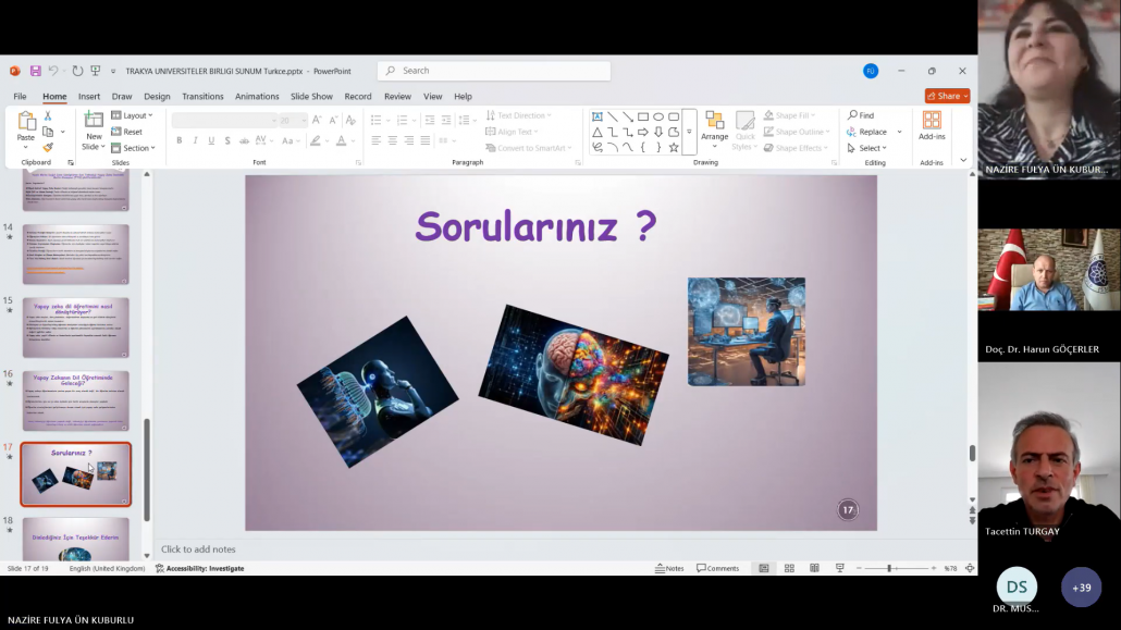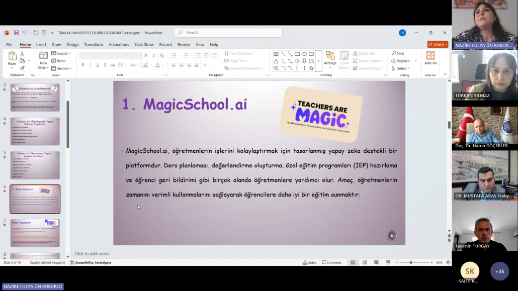 Trakya Üniversiteler Birliği (TÜB) Yabancı Diller Yüksekokulları Alt Çalışma Grubu (YDYO AÇG) tarafından düzenlenen “Sınıf İçi İyi Uygulama Örnekleri” seminer serisinin on ikincisi, “Yabancı Dil Öğretiminde Yapay Zekâ Uygulama Örnekleri” başlığıyla 14 Nisan 2025 tarihinde çevrim içi olarak gerçekleştirilmiştir. Trakya Üniversiteler Birliği Genel Sekreteri Dr. Öğr. Üyesi Mustafa ARAS açılış konuşmalarının ardından etkinliğe Kırklareli Üniversitesi Yabancı Diller Yüksekokulu Müdürü Doç. Dr. Tacettin TURGAY‘ın moderatörlüğünde Öğr. Gör. Nazire Fulya ÜN KUBURLU ‘nun yapay zekâ destekli uygulamaların yabancı dil öğretiminde kullanımına dair bir sunumu ile devam edilmiştir. Sunumda, yapay zekâ teknolojilerinin öğretmenlerin materyal geliştirme, ders planlama, ölçme-değerlendirme ve öğrenci etkileşimi gibi süreçleri nasıl kolaylaştırdığına değinilmiş ve çeşitli uygulama örnekleri sunulmuştur. Ayrıca, yapay zekâ uygulamalarının zaman tasarrufu sağlaması, kişiselleştirilmiş içerikler oluşturulmasına olanak tanıması ve sınıf içi etkileşimi artırması gibi avantajları vurgulanmış ve çeşitli uygulama örnekleri sunulmuştur.