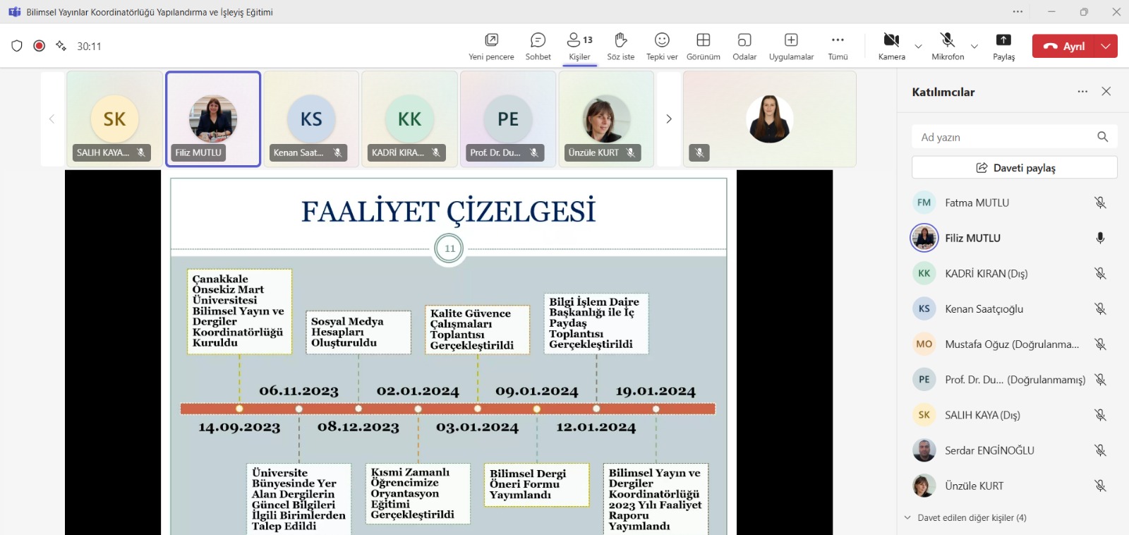 Prof. Dr. Evren KARAYEL GÖKKAYA başkanlığında, Dr. Öğr. Üyesi Filiz MUTLU’nun tarafından gerçekleşen eğitimde, bilimsel yayın ve dergi süreçlerinin daha verimli yürütülmesi, koordinatörlük organizasyon yapısının oluşturulması, kalite ve iyileştirme çalışmaları hakkında bilgiler paylaşıldı. Bu eğitimde Trakya Üniversiteler Birliği Koordinatörü Doç. Dr. Ünzüle KURT hazır bulundu.