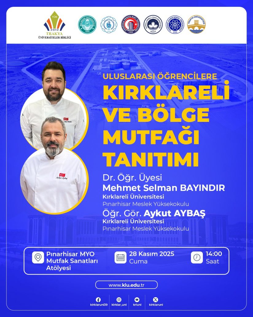 Etkinlik, 28 Kasım 2025 Cuma günü Pınarhisar Meslek Yüksekokulu Mutfak Sanatları Atölyesi’nde gerçekleştirilecek. Programda, Kırklareli Üniversitesi Pınarhisar MYO’dan Dr. Öğr. Üyesi Mehmet Selman Bayındır ve Öğr. Gör. Aykut Aybaş, bölgenin gastronomik mirasını, yerel ürünlerini ve yöresel yemek kültürünü uluslararası öğrencilerle paylaşacak.