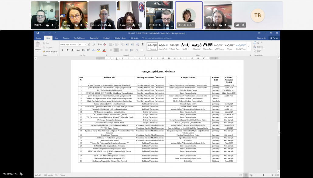 Trakya Üniversiteler Birliği (TÜB) 25. Alt Kurul Toplantısı, üye üniversitelerin rektör yardımcılarının katılımıyla gerçekleştirildi. Toplantıya, Çanakkale Onsekiz Mart Üniversitesi Rektör Yardımcısı Prof. Dr. Evren Karayel Gökkaya, Tekirdağ Namık Kemal Üniversitesi Rektör Yardımcısı Prof. Dr. Mustafa Taşan, Kırklareli Üniversitesi Rektör Yardımcısı Prof. Dr. Kadriye Eylem Özkaya Lassalle, Balıkesir Üniversitesi Rektör Yardımcısı Prof. Dr. Murat Doğdubay, Trakya Üniversitesi Rektör Yardımcısı Prof. Dr. Mustafa Tan ile Bandırma Onyedi Eylül Üniversitesi Rektör Yardımcısı Prof. Dr. Ebru Kaya Mutlu katıldı.